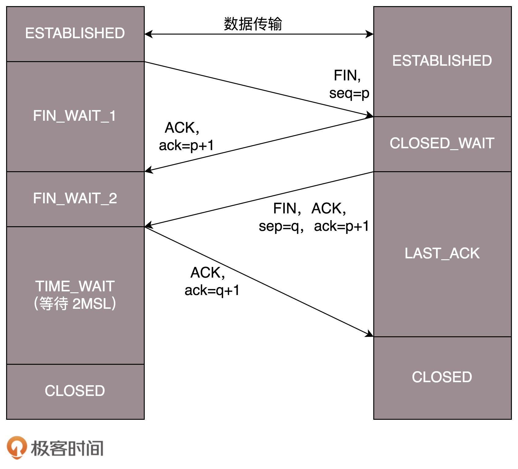 那怎么解决这些问题呢?TCP协议专门设计了几个状态来处理这些问题。我们来看断开连接的时候的状态时序图。
