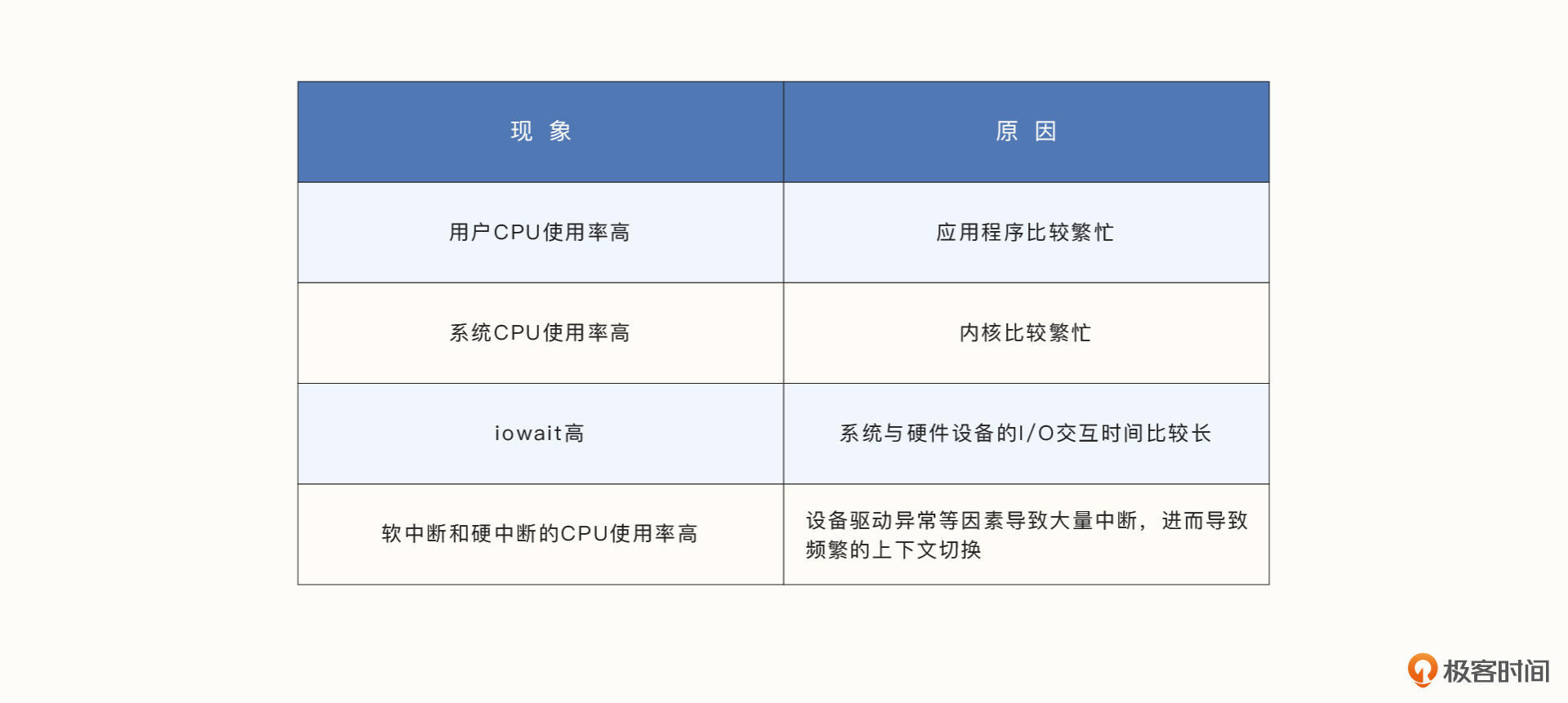 例如我们要排查系统CPU利用率异常的问题,其实就是要查看CPU在一段时间内更多的在做哪一部分的工作。我们期望CPU能够更多的执行应用程序交代的工作,而不是陷入到执行内核线程或者是大量时间堵塞在与硬件设备的I/O交互中。