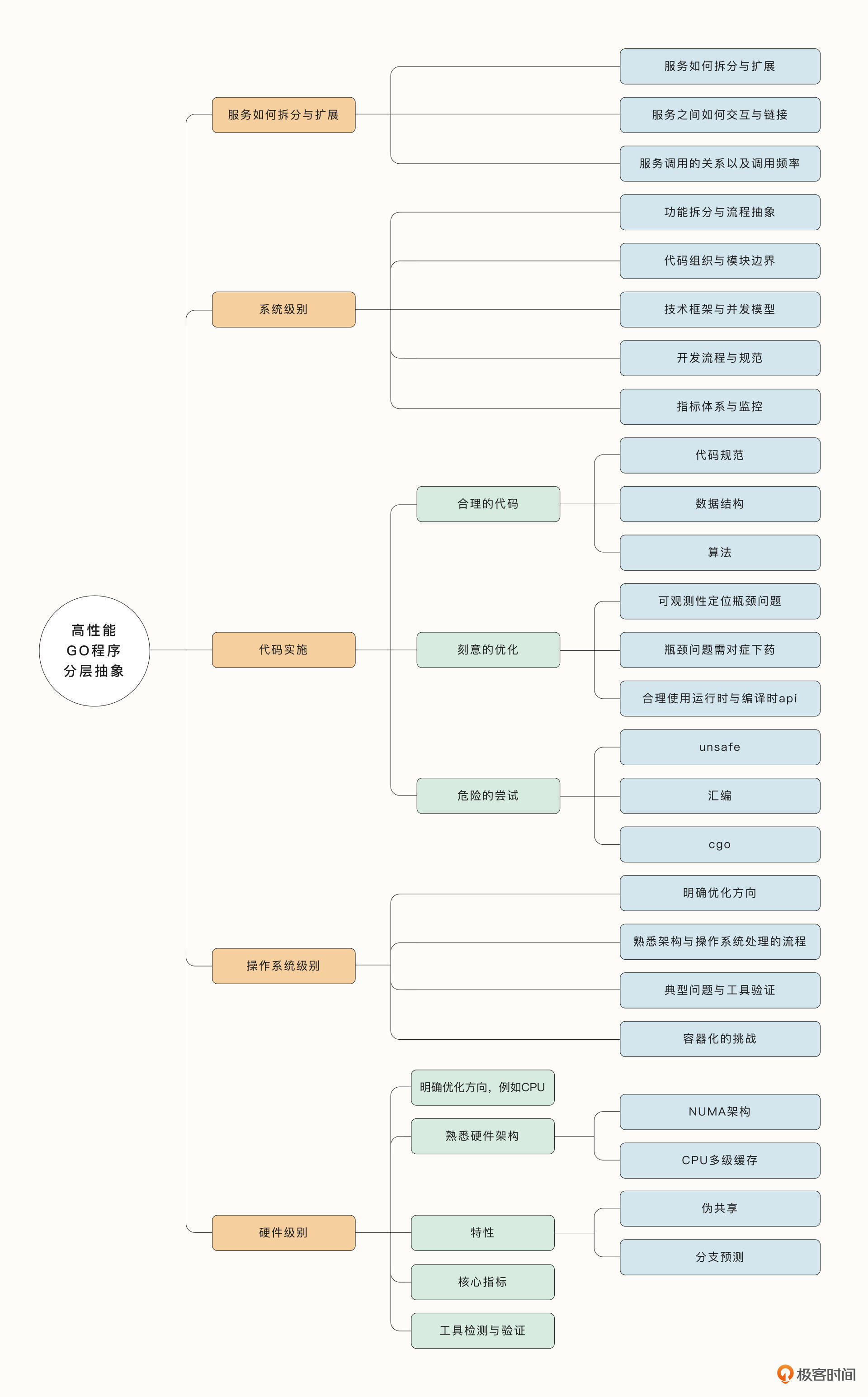 在这两节课里,我通过分层抽象的方法,带着你从最底层的硬件到最上层的系统设计,从设计、开发到发现问题和调优,拆解了性能问题的方方面面。希望能够帮助你查漏补缺,在遇到瓶颈问题时有的放矢。我也给你画了一张详细的思维导图,供你随时查看。