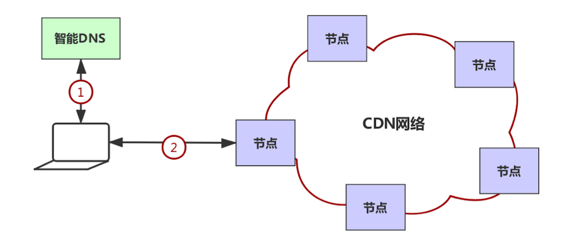 当用户访问 CDN 网络时,它首先通过智能DNS获取与用户距离最近的边缘节点,如下图所示: