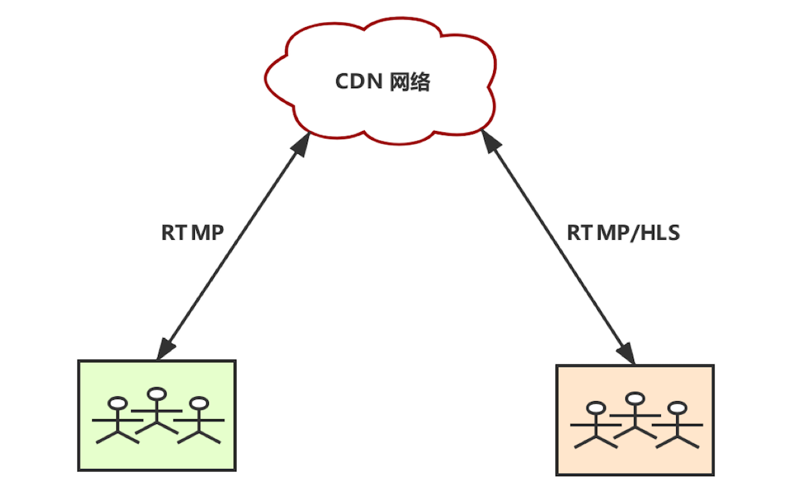对于共享端和观看端来说,使用 CDN 网络与使用流媒体服务器没什么区别。它们都是将流推送给指定的流媒体服务器,然后从指定的播放地址拉流,并最终进行展示这样一个过程。
