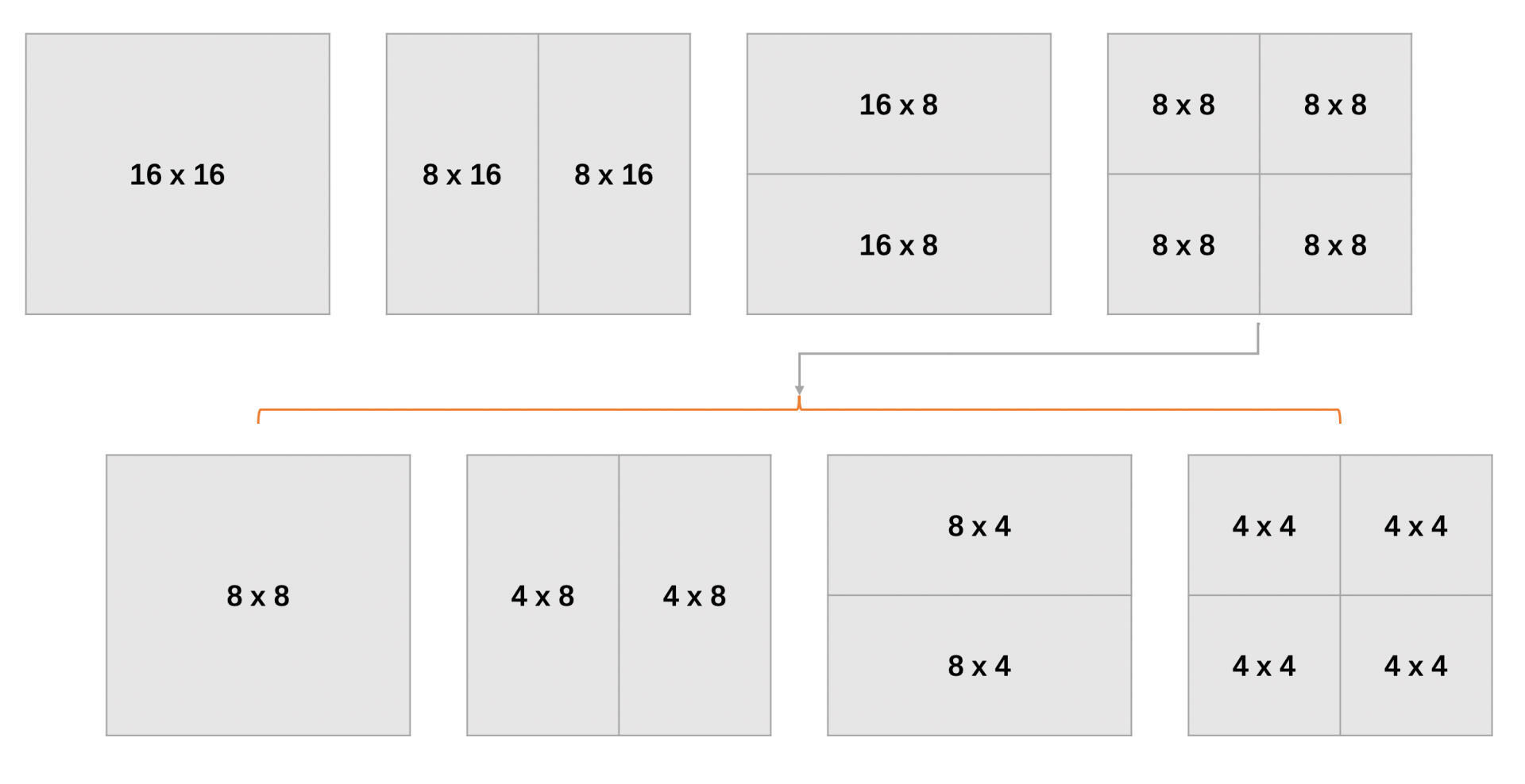 - 如果4个cost4x4之和小于cost8x8,则将8 x 8块划分成4 x 8和8 x 4两种子块分别求得cost4x8和cost8x4,再根据4个cost4x4、2个cost4x8和2个cost8x4的大小,选择最终的8x8划分的方式,并将对应的cost值更新到cost8x8。