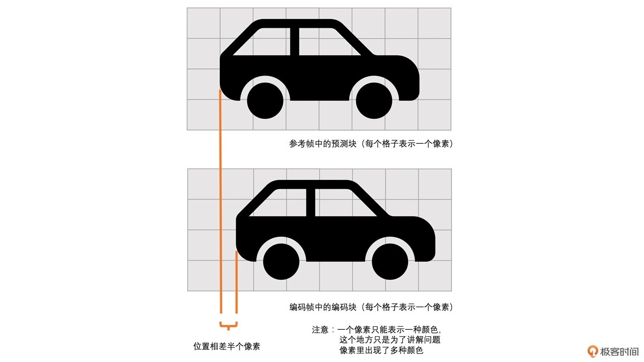 其实没关系的,我们还是可以使用(-48,0)作为运动矢量,只是预测块中的小车位置与我们编码块中的小车位置会相差个0.5或者0.25个像素,得到的残差会大一些,压缩效率稍微低一些,问题也不大。