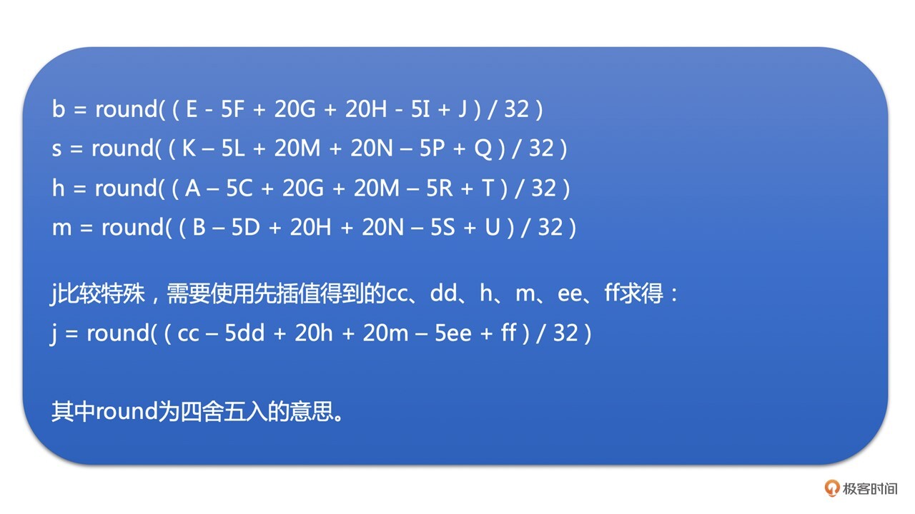 半像素点的插值是以6个整像素点使用六抽头插值滤波器计算得到的,滤波器权重系数为:(1/32, -5/32, 5/8, 5/8, -5/32, 1/32)。具体计算方法如下: