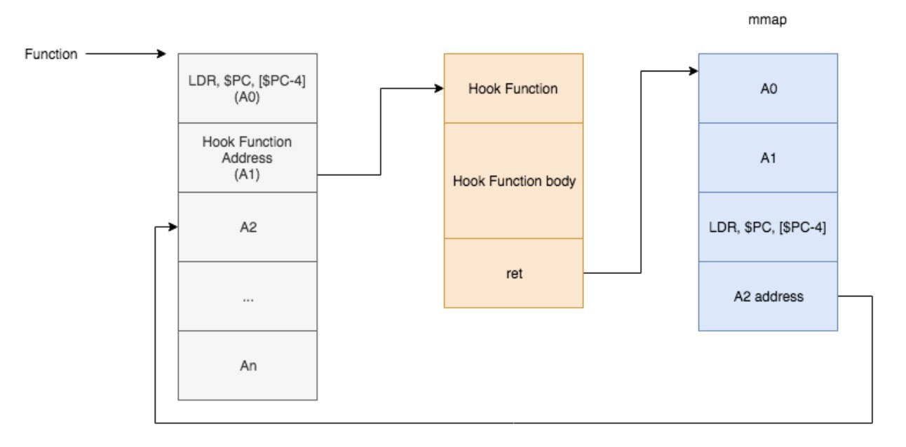 与GOT/PLT Hook相比,Inline Hook可以不受GOT/PLT表的限制,几乎可以Hook任何函数。不过其实现十分复杂,我至今没有见过可以用在生产环境的实现。并且在ARM体系结构下,无法对叶子函数和很短的函数进行Hook。