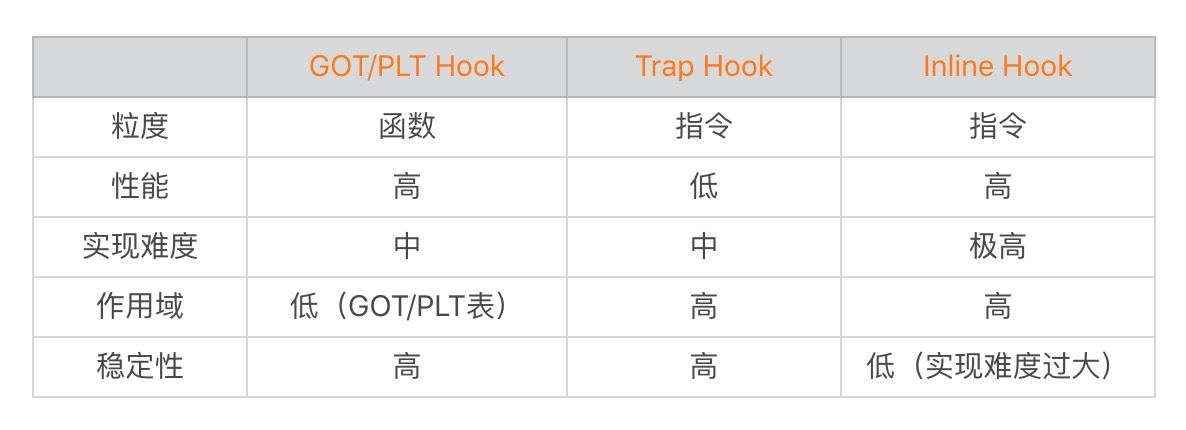 对于Native Hook技术,我们比较熟悉的有GOT/PLT Hook、Trap Hook以及Inline Hook,下面我来逐个讲解这些Hook技术的实现原理和优劣比较。