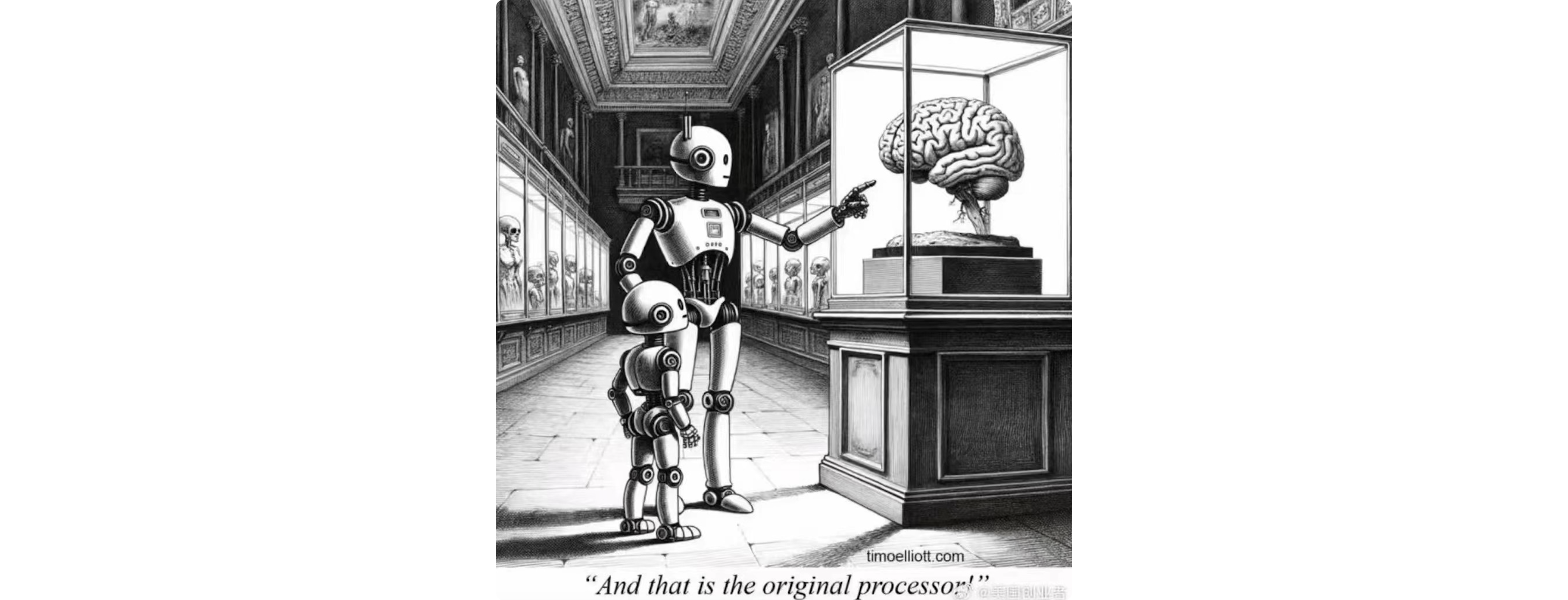 前两天看到一张漫画,一个大人工智能机器人带着小人工智能机器人在博物馆里指着一个人类的大脑标本说:“瞧,这就是第一代的处理器”。 这个图表达的是人工智能在无监管的发展下可能会给人类带来灾难的后果,但是解读成“人脑是第一代处理器”的比喻,似乎也是有迹可循的。