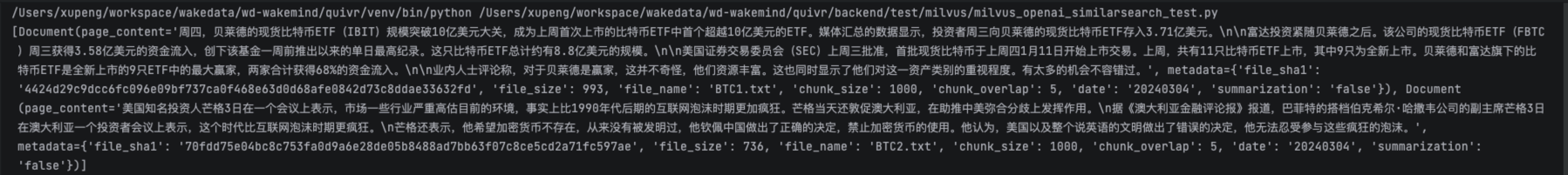 当然,实际存储中,一般会对新闻内容做切分分段存储。如果需要查询7天内关于比特币的新闻,向量数据库可以使用publish_dt标量先做精准过滤,然后再使用vector做相似性查询。下面使用Milvus向量数据库的python SDK实现了一个标量与向量的混合查询,简化的代码片段如下所示。