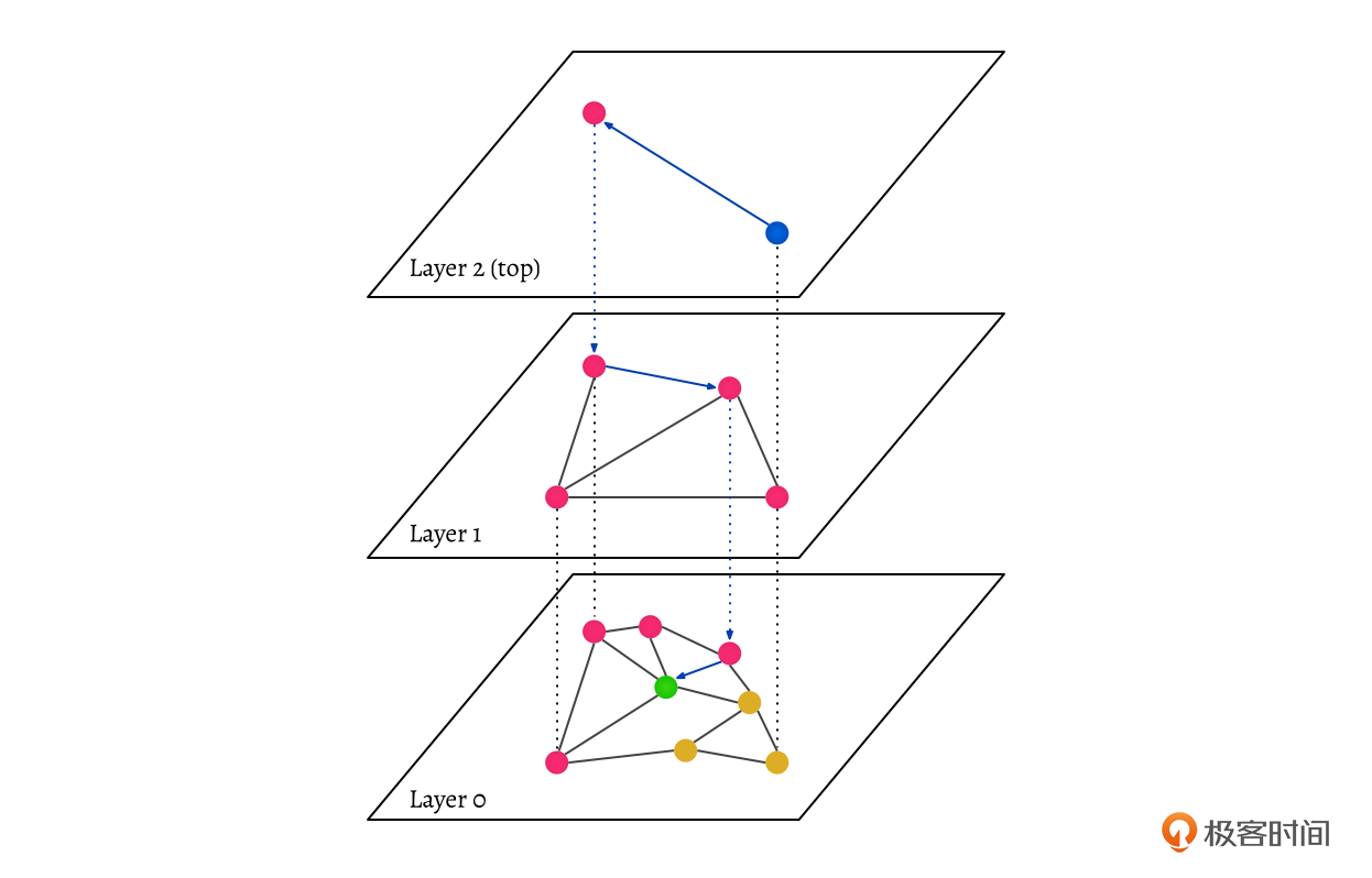 搜索的时候会从顶层开始,在每层里,算法会选择与当前点最近的节点,然后移动到这个节点。当无法进一步接近时,搜索就下降一层,直到达到最底层。图中搜索蓝色节点数据的搜索路径就如蓝色的虚线所示,最终在Layer0层找到了蓝色节点在Layer0层的近似最近邻,也就是绿色的节点。