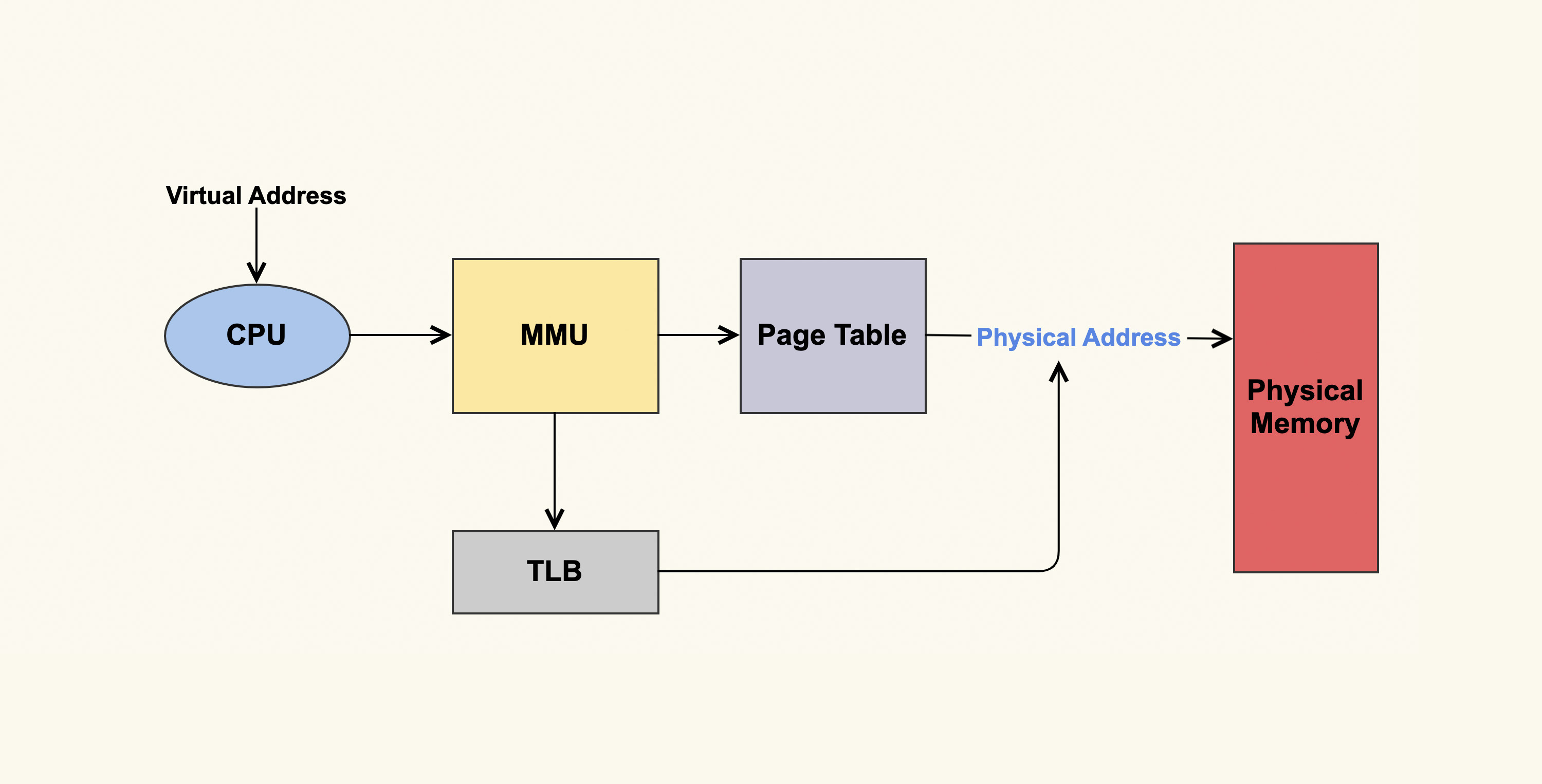 如上图所示,Paging的大致过程是,CPU将要请求的虚拟地址传给MMU(Memory Management Unit,内存管理单元),然后MMU先在高速缓存TLB(Translation Lookaside Buffer,页表缓存)中查找转换关系,如果找到了相应的物理地址则直接访问;如果找不到则在地址转换表(Page Table)里查找计算。最终进程访问的虚拟地址就对应到了实际的物理地址。