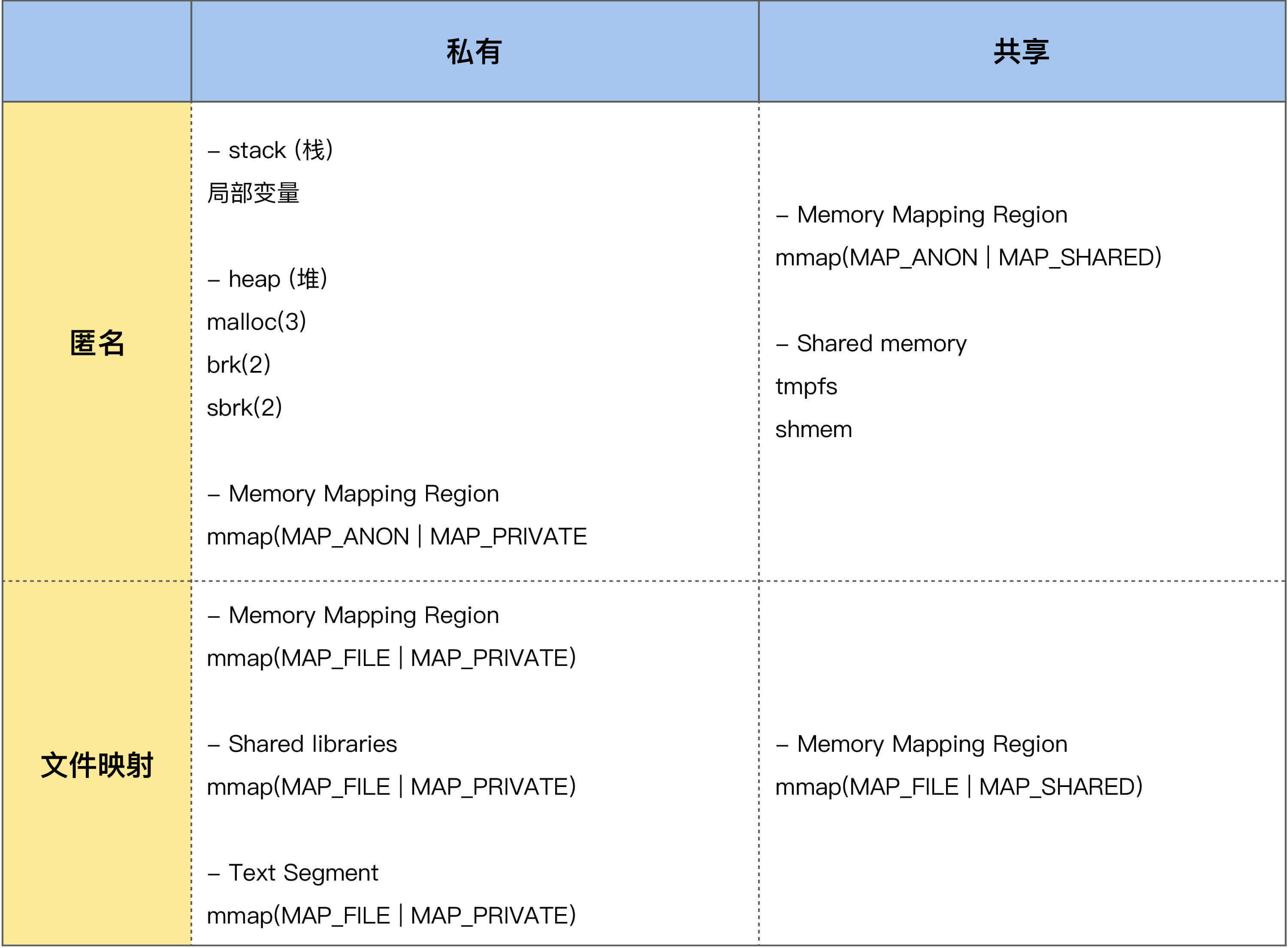 - 进程的内存类型可以从anon(匿名)与file(文件)、private(私有)与shared(共享)这四项来区分为4种不同的类型,进程相关的所有内存都是这几种方式的不同组合。