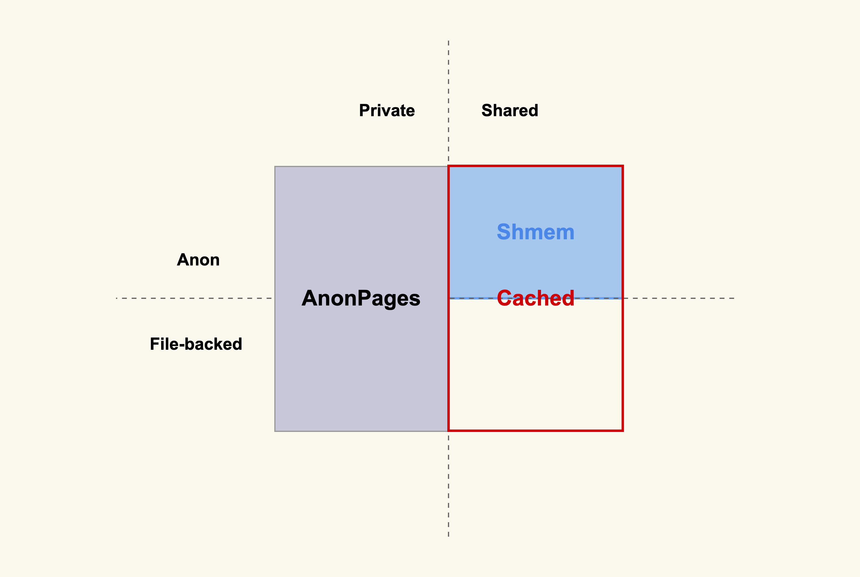 如上图所示,凡是私有的内存都会体现在/proc/meminfo中的AnonPages这一项,凡是共享的内存都会体现在Cached这一项,匿名共享的则还会体现在Shmem这一项。