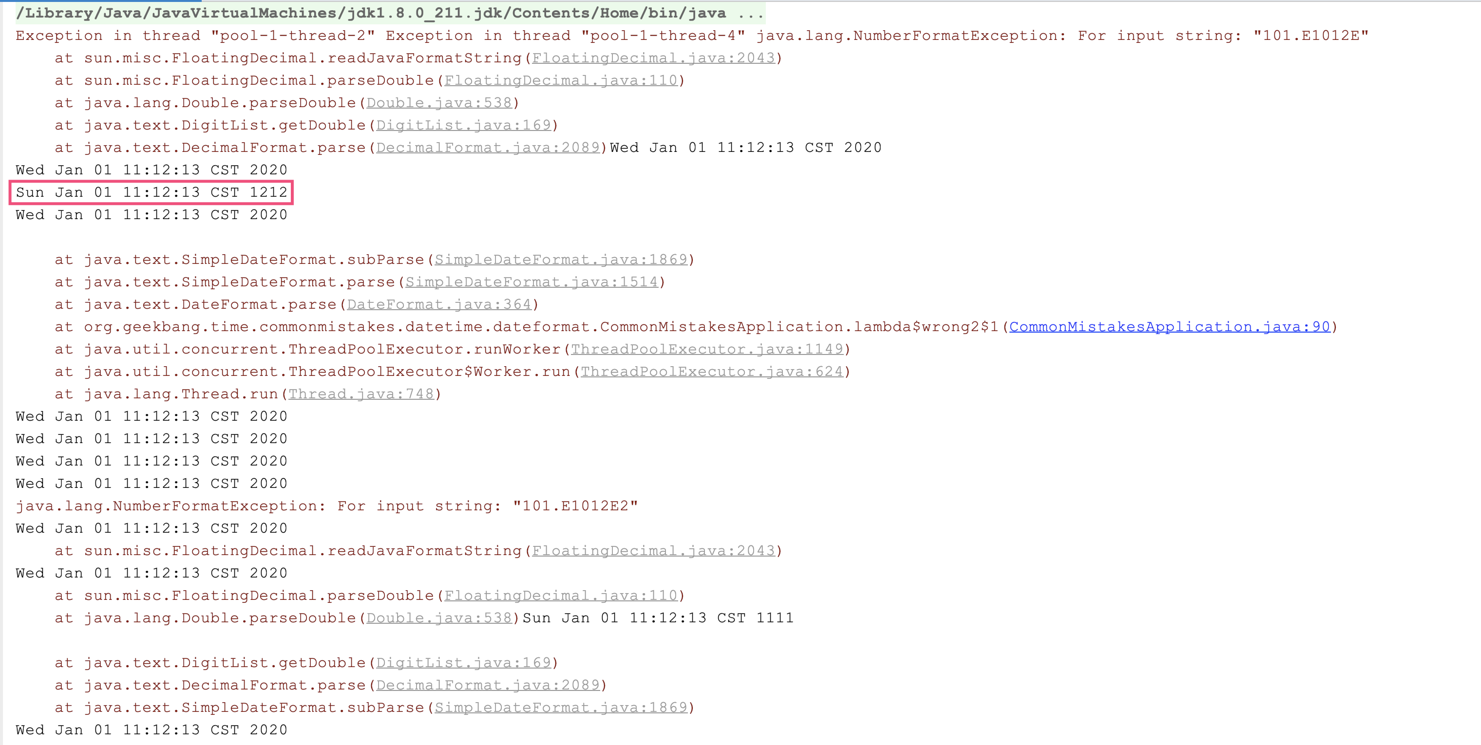 第一个坑是,**定义的static的SimpleDateFormat可能会出现线程安全问题。**比如像这样,使用一个100线程的线程池,循环20次把时间格式化任务提交到线程池处理,每个任务中又循环10次解析2020-01-01 11:12:13这样一个时间表示: