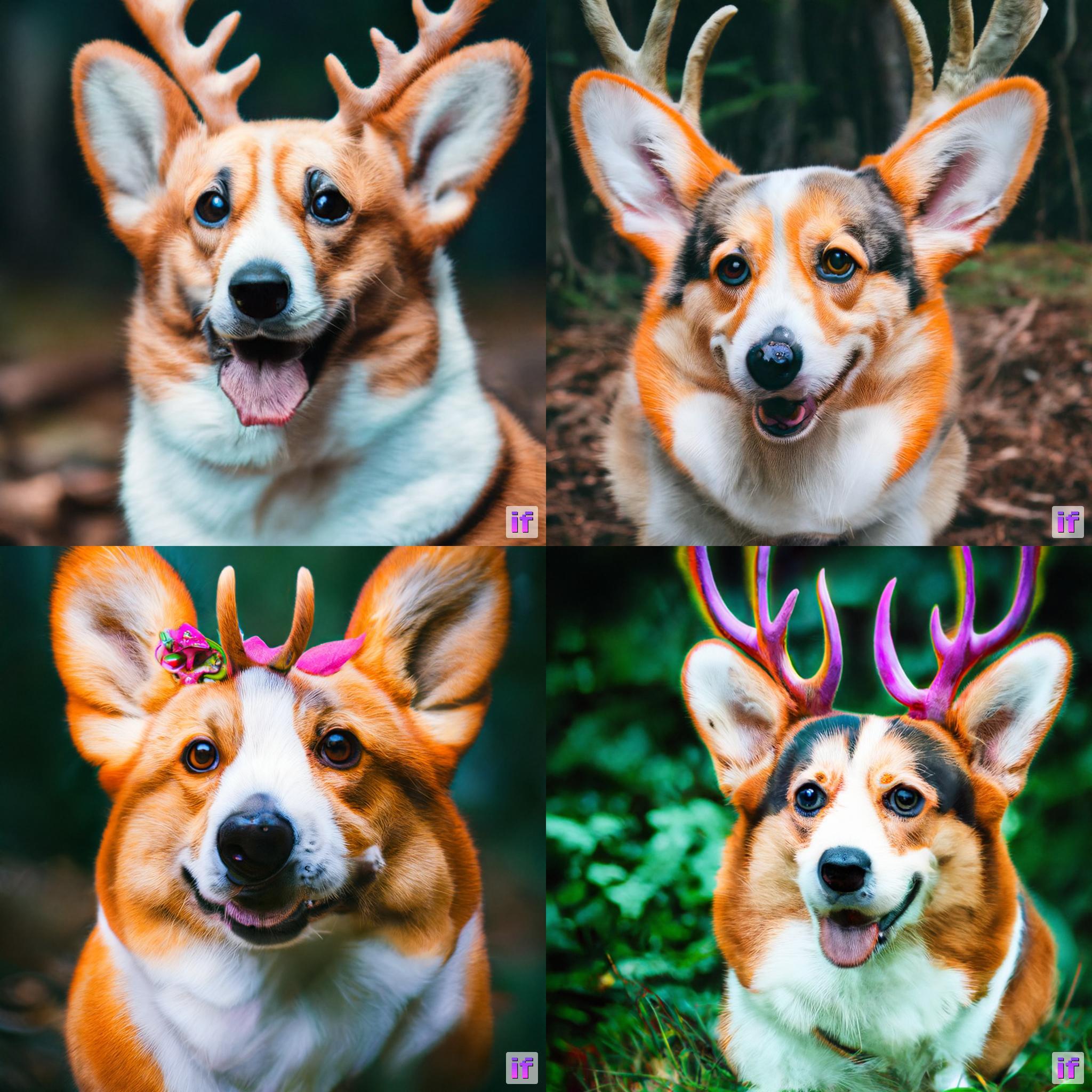 1 | prompt = 'ultra close-up color photo portrait of rainbow corgi with deer horns in the woods' |