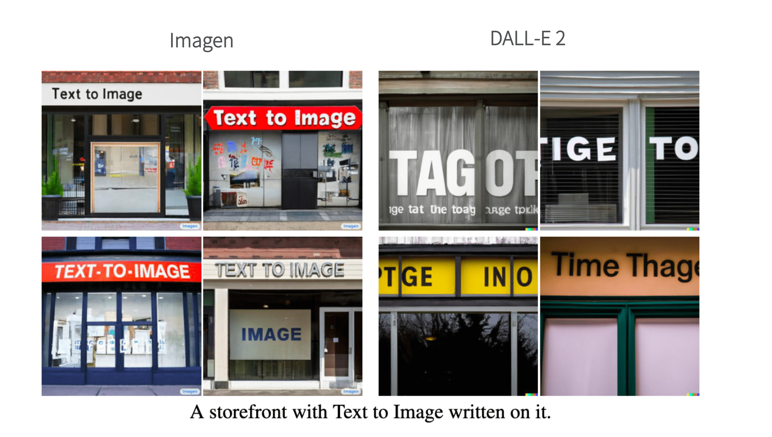 Imagen可以在生成的图像中指定写入的文字,之后我们简称这个能力为“Text-in-Image”。这项能力上,DALL-E 2和Imagen的效果对比如下图所示。