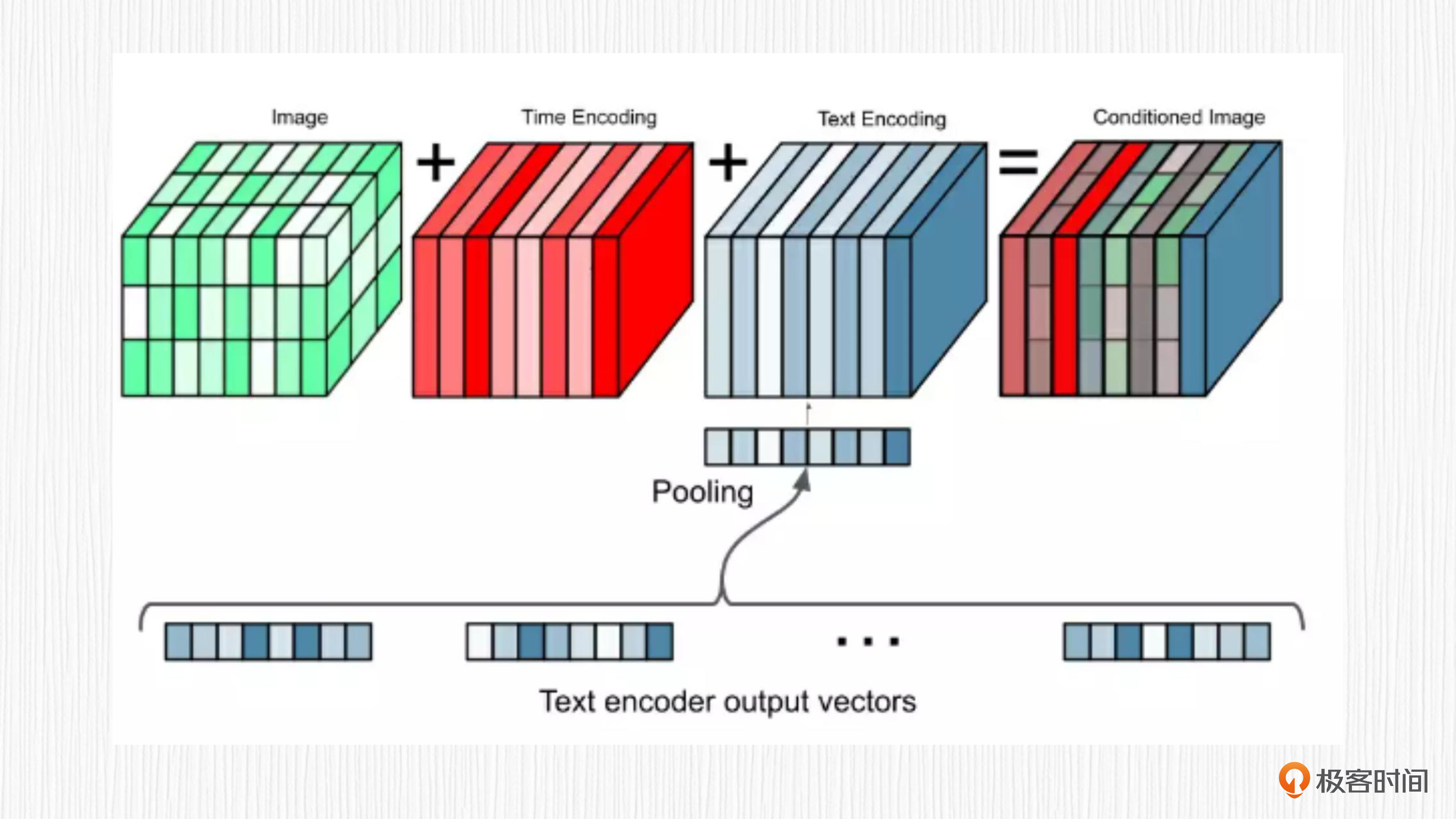 在Imagen项目中,图像解码器使用的同样是扩散模型。扩散过程需要多步来完成,逐渐从噪声得到清晰图像。对于每一步去噪,Imagen都会将当前带噪声图像、时间步编码、文本表征编码进行求和,作为UNet模型的输入信息,如下图所示。