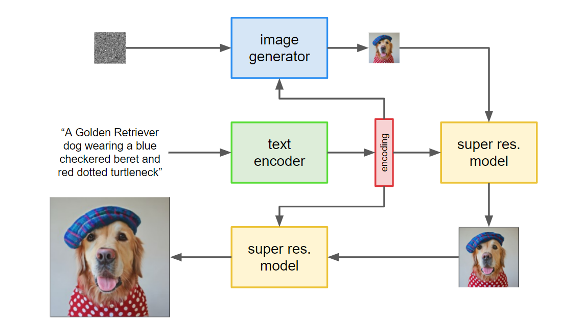 训练过程中,首先要将文本表征、初始噪声作为扩散模型的输入,去噪后的图像作为目标输出,就得到了低分辨率扩散模型;然后将低分辨率图像、文本表征作为输入,去噪后的图像作为目标输出,得到更高分辨率的扩散模型。