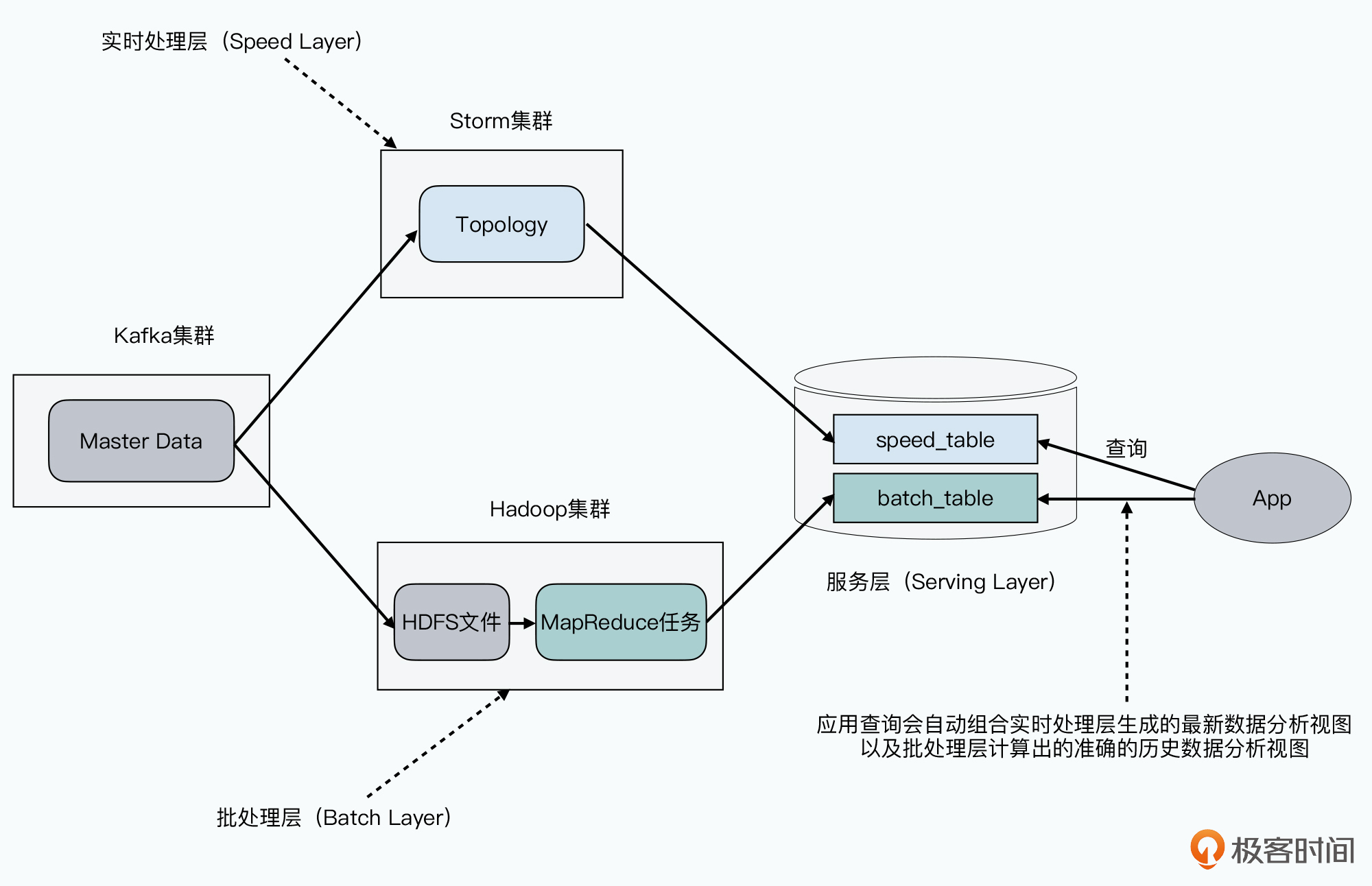 - 最后是一个服务层(Serving Layer),通常体现为一个数据库。批处理层的计算结果和实时处理层的结果,会写入到这个数据库里。并且,后生成的批处理层的结果,会不断替代掉实时处理层的计算结果,也就是对于最终计算的数据进行修正。