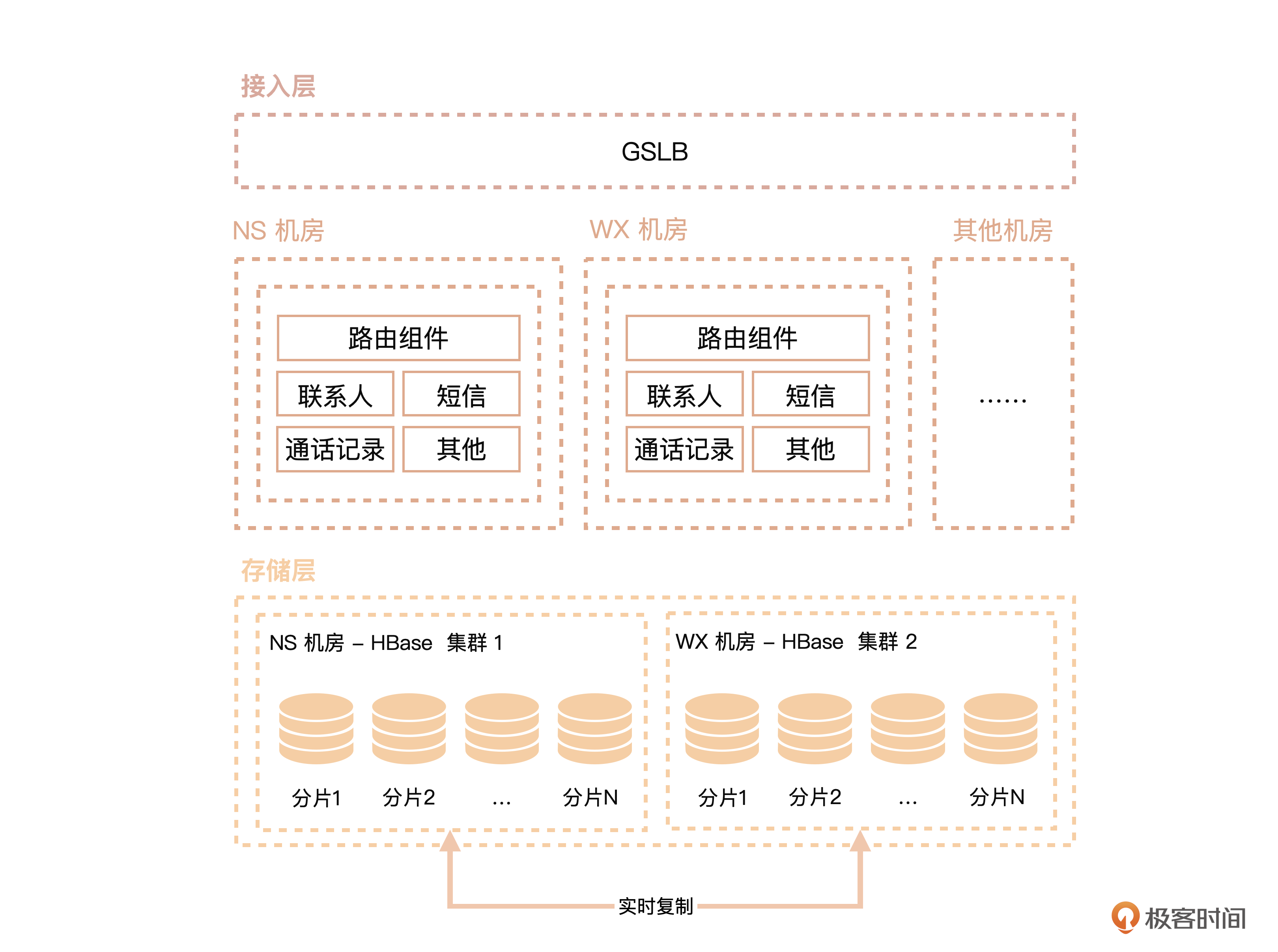 你可以看到整个系统的业务逻辑层基本没有变化,只是换了一个存储层。然后在存储层的不同机房集群之间配置了实时复制。注意,配置复制的时候,并不需要整个集群一起复制,你可以灵活地配置到表的列族级别复制。