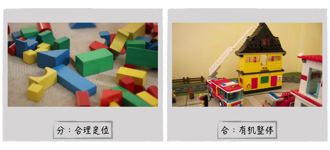 举个例子,我们都知道GoF的23个设计模式,在Builder模式中,它的主逻辑只需要给出各个部件的组装关系即可,它不关心创建某个具体部件的内部逻辑,这个可以交给工厂模式去实现。这里,Builder模式负责粗粒度的组装逻辑,它承担的是合的部分;工厂模式负责细粒度的构造逻辑,承担的是分的部分,大家各自管理自己的复杂性。