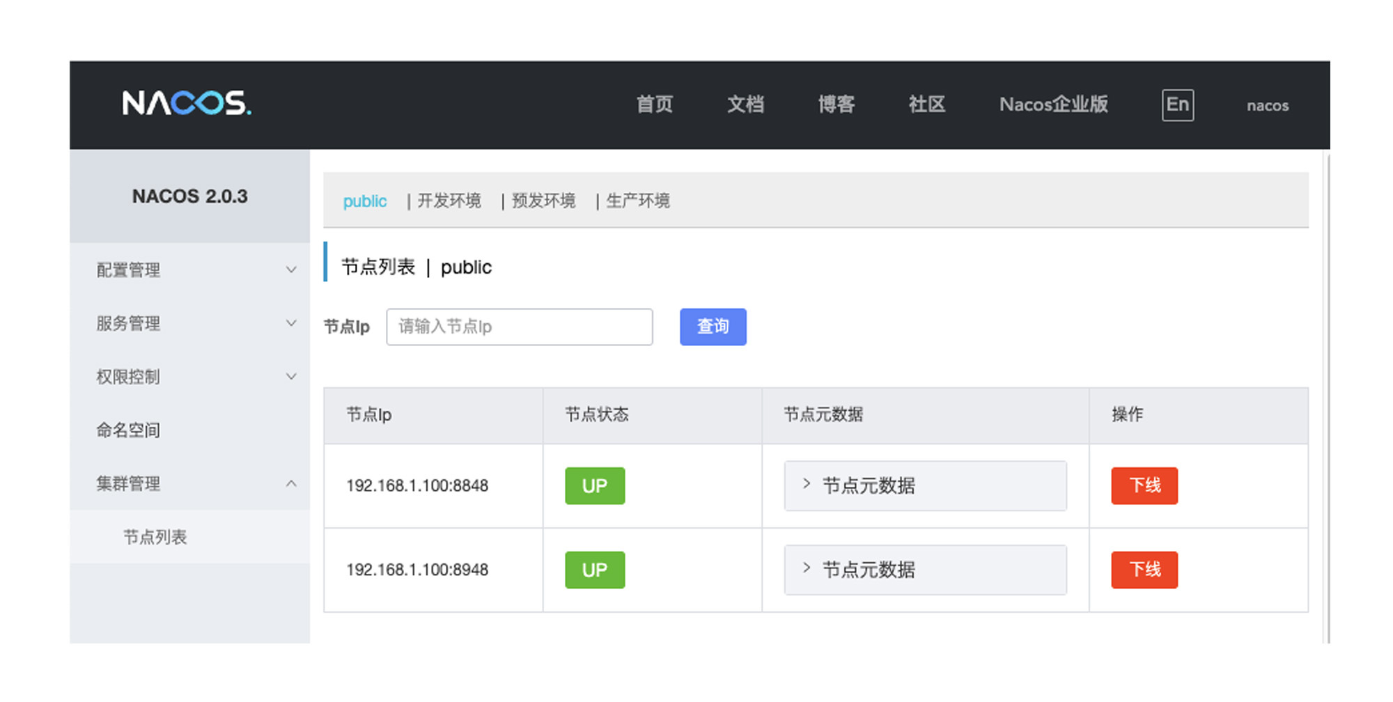 为了验证集群环境处于正常状态,你可以在左侧导航栏中打开“集群管理”下的“节点列表”页面,在这个页面上显示了集群环境中所有的Nacos Server节点以及对应的状态,在下面的图中我们可以看到192.168.1.100:8848和192.168.1.100:8948两台服务器,并且它们的节点状态都是绿色的“UP”,这表示你搭建的集群环境一切正常。