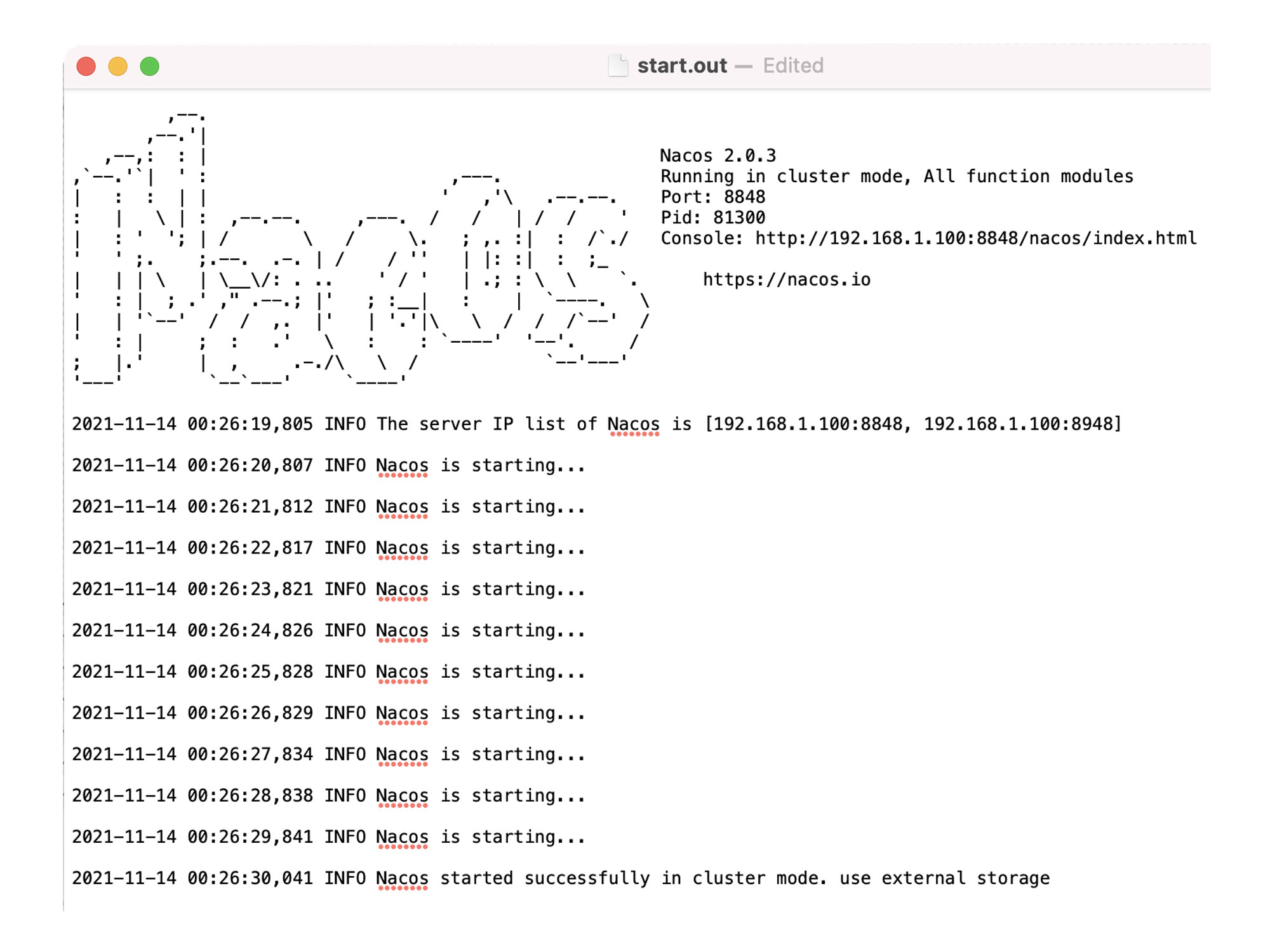 这两行启动日志没有告诉你Nacos Server最终是启动成功还是失败,不过你可以在第二行日志中找到一些蛛丝马迹。这行日志告诉了我们启动日志所在的位置是nacos-cluster1/logs/start.out,在启动日志中你可以查看到一行成功消息“Nacos started successfully in cluster mode”。当然了,如果启动失败,你也可以在这里看到具体的Error Log。