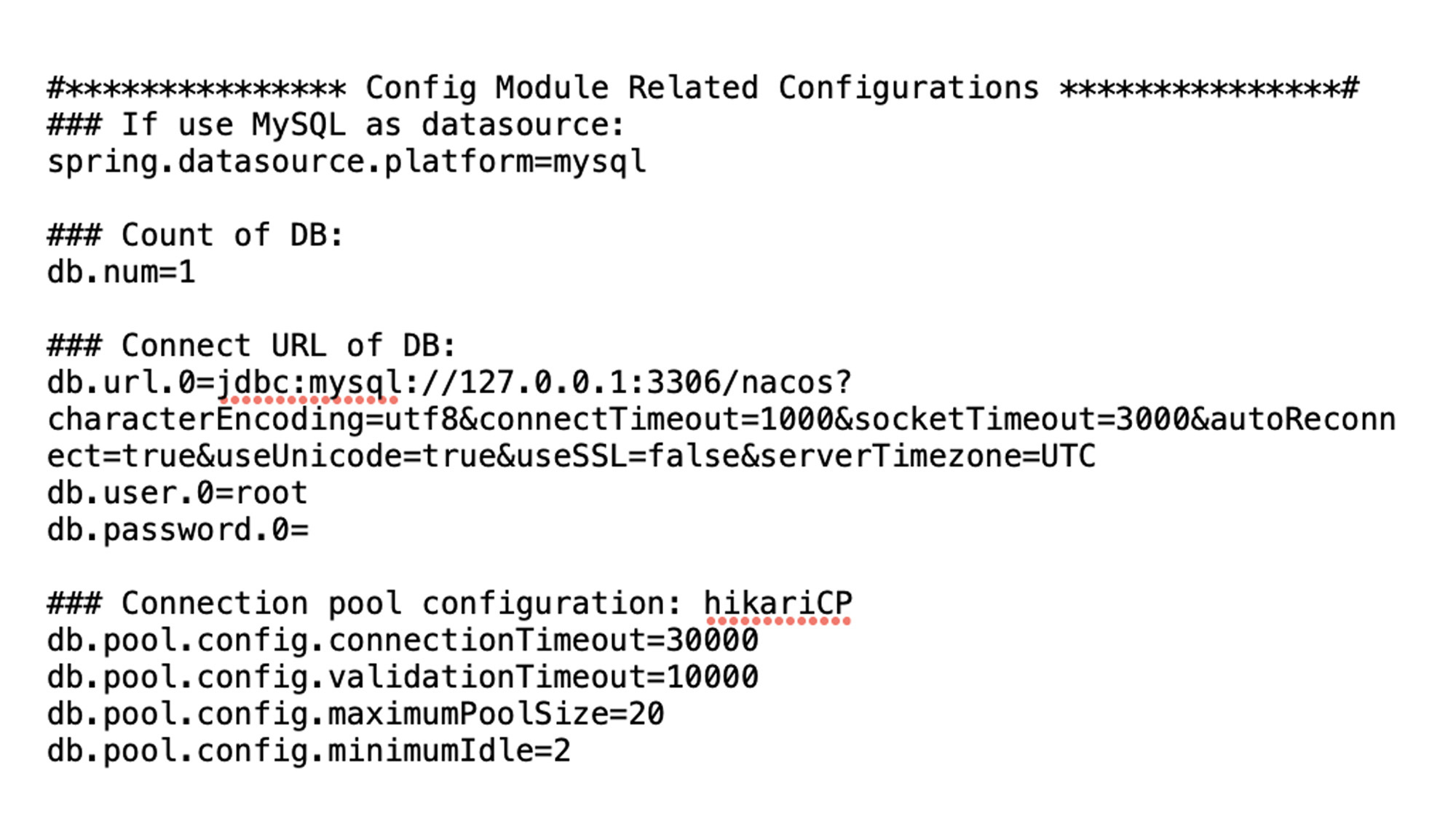 - 修改JDBC连接串:db.url.0指定了数据库连接字符串,我指向了localhost 3306端口的nacos数据库,稍后我将带你对这个数据库做初始化工作;db.user.0和db.password.0分别指定了连接数据库的用户名和密码,我使用了默认的无密码root账户。