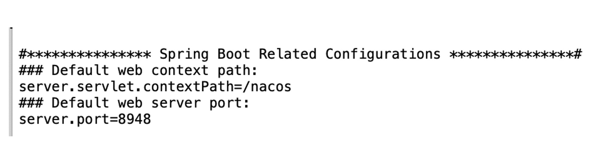 Nacos Server的启动项位于conf目录下的application.properties文件里,别看这个文件里的配置项密密麻麻一大串,但大部分都不用你操心,直接使用默认值就好。你只需要修改这里面的服务启动端口和数据库连接串就好了。