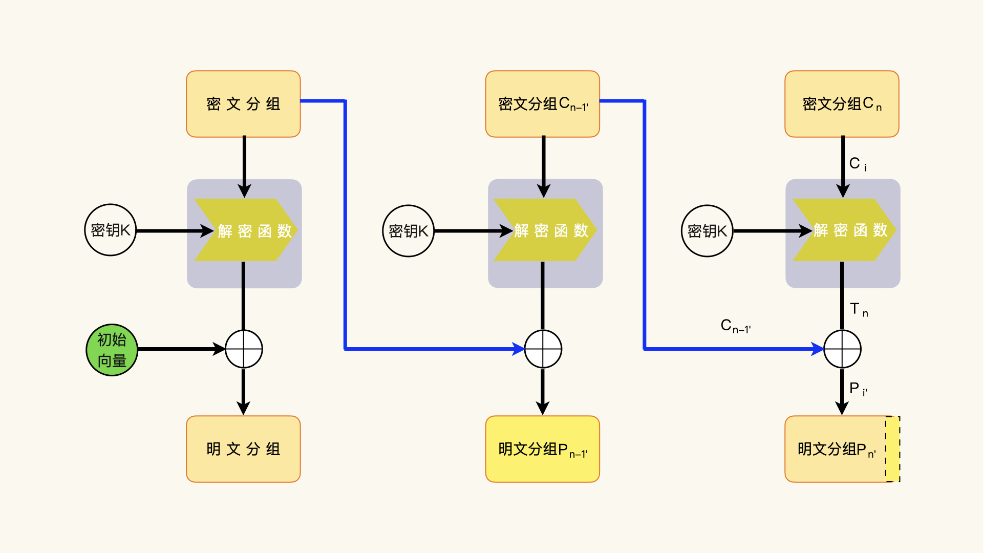 这一次的密文分组Ci和密钥K,通过解密函数的运算,可以产生一个中间结果Ti,也就是解密函数运算的中间结果Ti;然后,解密函数运算结果Ti和上一次的密文分组进行异或运算,获得明文分组Pi,Pi = Ci-1 ^ Ti。