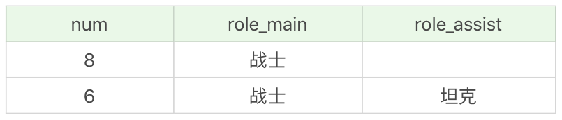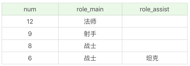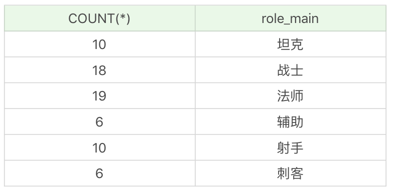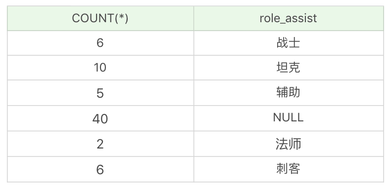 需要说明的是,有些英雄没有次要定位,即role_assist为NULL,这时COUNT(role_assist)会忽略值为NULL的数据行,而COUNT(*)只是统计数据行数,不管某个字段是否为NULL。