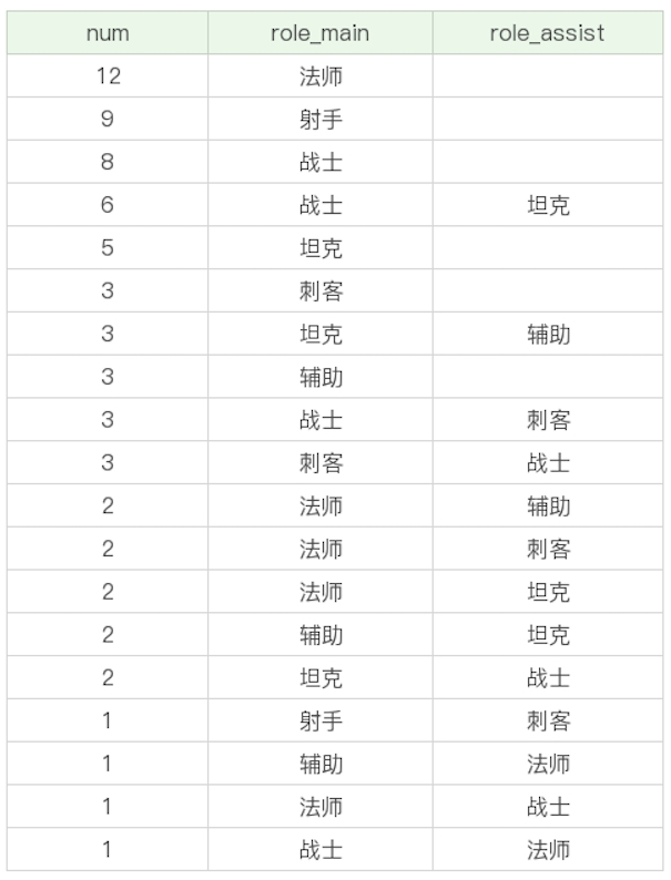 1 | SQL: SELECT COUNT(*) as num, role_main, role_assist FROM heros GROUP BY role_main, role_assist HAVING num > 5 ORDER BY num DESC |