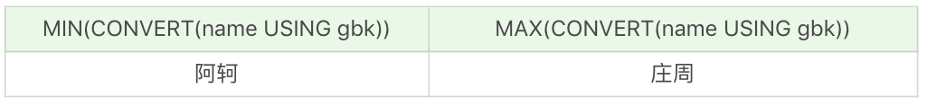 需要说明的是,我们需要先把name字段统一转化为gbk类型,使用CONVERT(name USING gbk),然后再使用MIN和MAX取最小值和最大值。