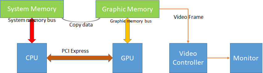 - 应用程序处理的图形数据都是保存在 System Memory中的,也就是我们经常所说的主内存中。需要硬件处理的时候,先将 System Memory 中的图形数据拷贝到 Graphic Memory中。