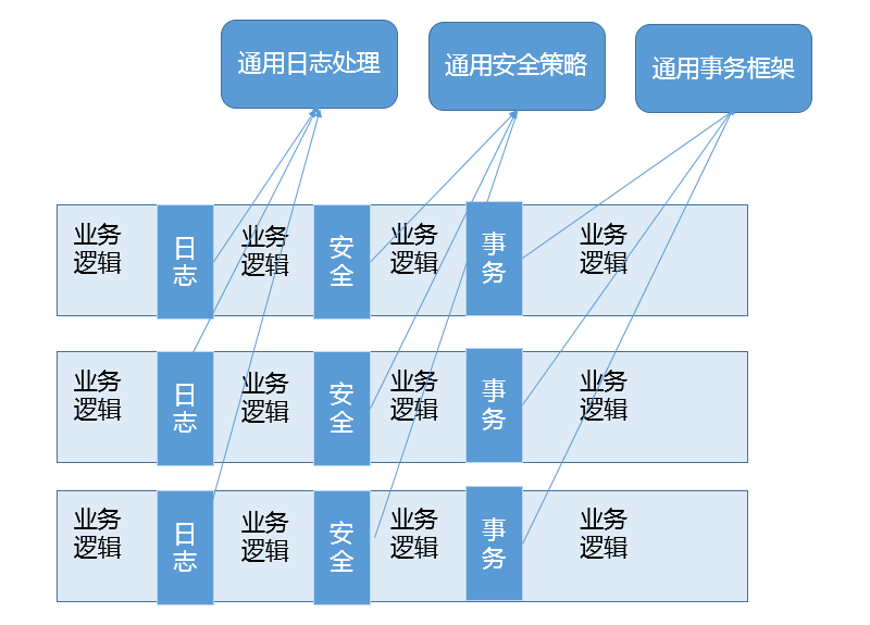 动态代理应用非常广泛,虽然最初多是因为RPC等使用进入我们视线,但是动态代理的使用场景远远不仅如此,它完美符合Spring AOP等切面编程。我在后面的专栏还会进一步详细分析AOP的目的和能力。简单来说它可以看作是对OOP的一个补充,因为OOP对于跨越不同对象或类的分散、纠缠逻辑表现力不够,比如在不同模块的特定阶段做一些事情,类似日志、用户鉴权、全局性异常处理、性能监控,甚至事务处理等,你可以参考下面这张图。