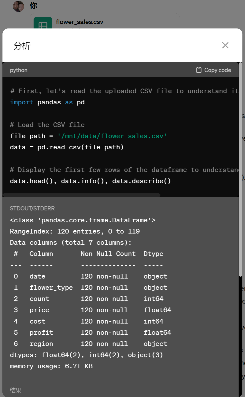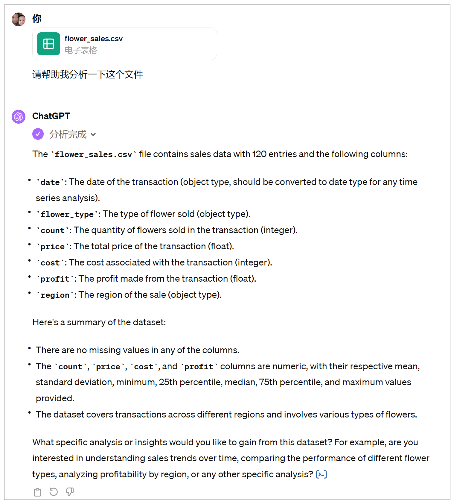 全部的message SyncCursorPage[Message](data=[Message(id='msg_cRSYdkrscxnyHXimfqqivQZn', assistant_id='asst_ZzFnvavBoYZ59NDLnLinNC99', attachments=[], completed_at=None, content=[TextContentBlock(text=Text(annotations=[], value="The top 5 most profitable flowers based on the total profit are listed below:\n1. **Rose** with a profit of \\$30,532.50\n2. **Tulip** with a profit of \\$25,037.00\n3. **Lily** with a profit of \\$15,823.00\n4. **Daisy** with a profit of \\$9,905.00\n5. **Sunflower** with a profit of \\$9,517.00\n\nThese results reveal which flower types are contributing most significantly to the business's bottom line. \n\nLet's move forward with the final task which involves forecasting the total revenue for the next 7 days using a Random Forest Regressor model. I will prepare the data and develop the model to perform this forecast."), type='text')], created_at=1713842457, incomplete_at=None, incomplete_details=None, metadata={}, object='thread.message', role='assistant', run_id='run_202iwnMlW8nJVbEKOMPWJqVT', status=None, thread_id='thread_D3JUkq05bfvtmBw7QoNSuTy7'), Message(id='msg_QZMADy6BrFb6LTGS0Ho7ruEi', assistant_id='asst_ZzFnvavBoYZ59NDLnLinNC99', attachments=[], completed_at=None, content=[ImageFileContentBlock(image_file=ImageFile(file_id='file-aUTB6yfVsc7AoI0SNfQteuwq'), type='image_file'), TextContentBlock(text=Text(annotations=[], value="The pie chart above presents the proportion of sales for each type of flower, indicating the relative popularity and market share of each flower type within the dataset.\n\nNext, we will proceed with task #4: identifying the top 5 most profitable flowers based on the total profit. I'll sum the profit for each flower type and display the top 5."), type='text')], created_at=1713842450, incomplete_at=None, incomplete_details=None, metadata={}, object='thread.message', role='assistant', run_id='run_202iwnMlW8nJVbEKOMPWJqVT', status=None, thread_id='thread_D3JUkq05bfvtmBw7QoNSuTy7'), Message(id='msg_r0ETiNGjOEaqFuEvw45auB52', assistant_id='asst_ZzFnvavBoYZ59NDLnLinNC99', attachments=[], completed_at=None, content=[ImageFileContentBlock(image_file=ImageFile(file_id='file-ARR9oWz1AdYwLCVeaDNsYfGk'), type='image_file'), TextContentBlock(text=Text(annotations=[], value='The line chart illustrates the daily total revenue from flower sales, showing various trends and fluctuations over time.\n\nMoving on to task #3, I will calculate the sales proportion of each flower type and visualize it using a pie chart.'), type='text')], created_at=1713842442, incomplete_at=None, incomplete_details=None, metadata={}, object='thread.message', role='assistant', run_id='run_202iwnMlW8nJVbEKOMPWJqVT', status=None, thread_id='thread_D3JUkq05bfvtmBw7QoNSuTy7'), Message(id='msg_pfR9okmWbQZTlX5FSpFwKji2', assistant_id='asst_ZzFnvavBoYZ59NDLnLinNC99', attachments=[], completed_at=None, content=[ImageFileContentBlock(image_file=ImageFile(file_id='file-DA3uSxFhVE8KqZFrWKY2YWTX'), type='image_file'), TextContentBlock(text=Text(annotations=[], value="The bar chart above displays the total revenue from flower sales for each region.\n\nNext, let's address task #2 by grouping the data by date and calculating the daily total revenue, which we will then visualize as a line chart to observe trends over time."), type='text')], created_at=1713842433, incomplete_at=None, incomplete_details=None, metadata={}, object='thread.message', role='assistant', run_id='run_202iwnMlW8nJVbEKOMPWJqVT', status=None, thread_id='thread_D3JUkq05bfvtmBw7QoNSuTy7'), Message(id='msg_SCX0Z8qv2VGtFHBGPJkp66E1', assistant_id='asst_ZzFnvavBoYZ59NDLnLinNC99', attachments=[], completed_at=None, content=[TextContentBlock(text=Text(annotations=[], value="The dataset contains the following columns:\n- `date`: The date of sales\n- `flower`: Type of flower sold\n- `count`: The number of flowers sold\n- `price`: Total price received for the flowers sold\n- `cost`: Total cost of the flowers sold\n- `profit`: Total profit from the flower sales\n- `region`: Geographic region of the sales\n\nFrom your requests, we'll proceed with the analysis tasks:\n1. Group the data by region and calculate the total revenue for each region.\n2. Group the data by date and calculate the daily total revenue.\n3. Calculate the sales proportion of each flower type.\n4. Find the top 5 most profitable flowers based on the total profit.\n\nLet's start with task #1 and visualize the total revenue for each region."), type='text')], created_at=1713842408, incomplete_at=None, incomplete_details=None, metadata={}, object='thread.message', role='assistant', run_id='run_202iwnMlW8nJVbEKOMPWJqVT', status=None, thread_id='thread_D3JUkq05bfvtmBw7QoNSuTy7'), Message(id='msg_0wyxD0pWM9DbMOevRVuuwPZW', assistant_id='asst_ZzFnvavBoYZ59NDLnLinNC99', attachments=[], completed_at=None, content=[TextContentBlock(text=Text(annotations=[], value="Let's start by examining the contents of the uploaded CSV file to understand its structure and data types. I will then proceed with the specified data analysis tasks."), type='text')], created_at=1713842399, incomplete_at=None, incomplete_details=None, metadata={}, object='thread.message', role='assistant', run_id='run_202iwnMlW8nJVbEKOMPWJqVT', status=None, thread_id='thread_D3JUkq05bfvtmBw7QoNSuTy7'), Message(id='msg_SujuDWSAVzkKVx45SrhVnQQL', assistant_id=None, attachments=[Attachment(add_to=None, file_id='file-XXkzo0wHANWlrkMd1ZnaESor', tools=[{'type': 'code_interpreter'}])], completed_at=None, content=[TextContentBlock(text=Text(annotations=[], value='Please perform the data analysis tasks as instructed.'), type='text')], created_at=1713842397, incomplete_at=None, incomplete_details=None, metadata={}, object='thread.message', role='user', run_id=None, status=None, thread_id='thread_D3JUkq05bfvtmBw7QoNSuTy7')], object='list', first_id='msg_cRSYdkrscxnyHXimfqqivQZn', last_id='msg_SujuDWSAVzkKVx45SrhVnQQL', has_more=False)