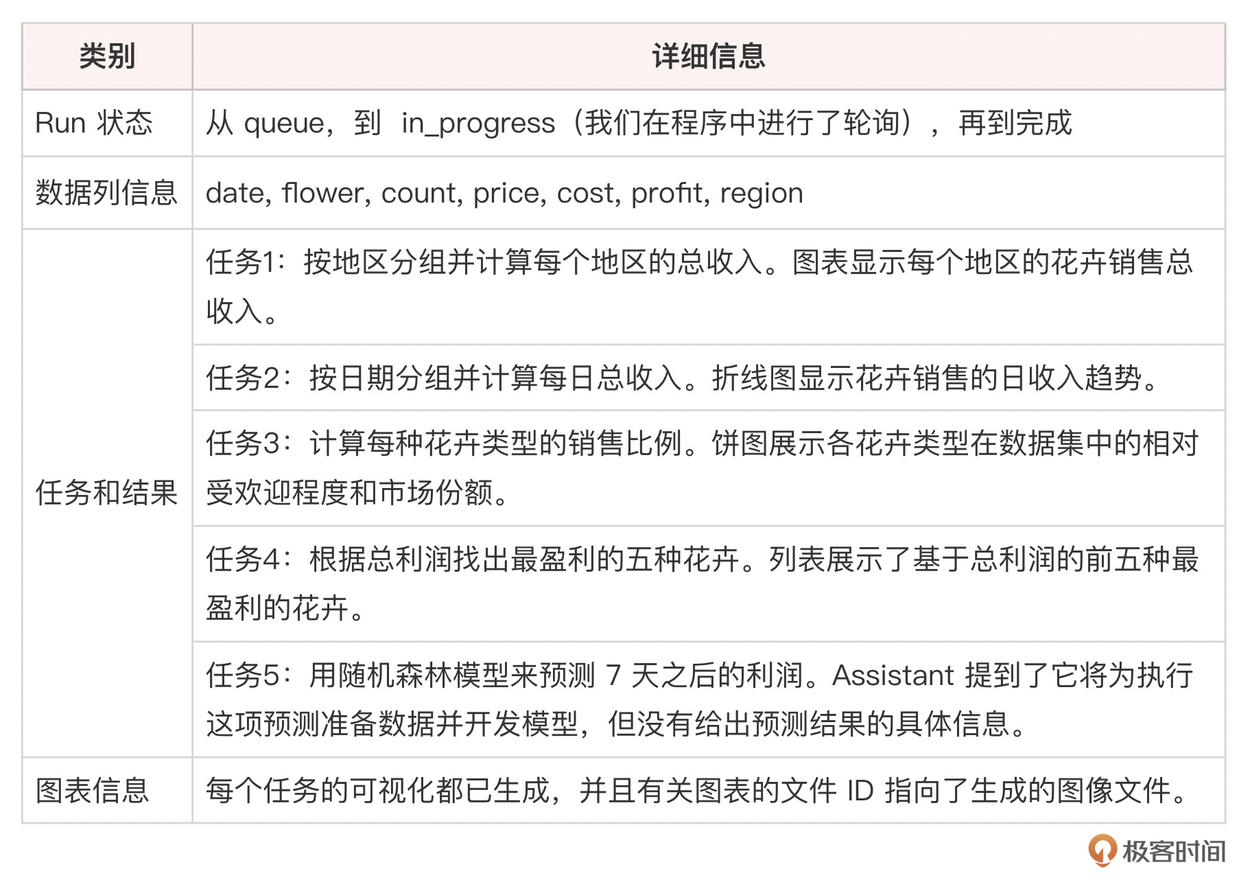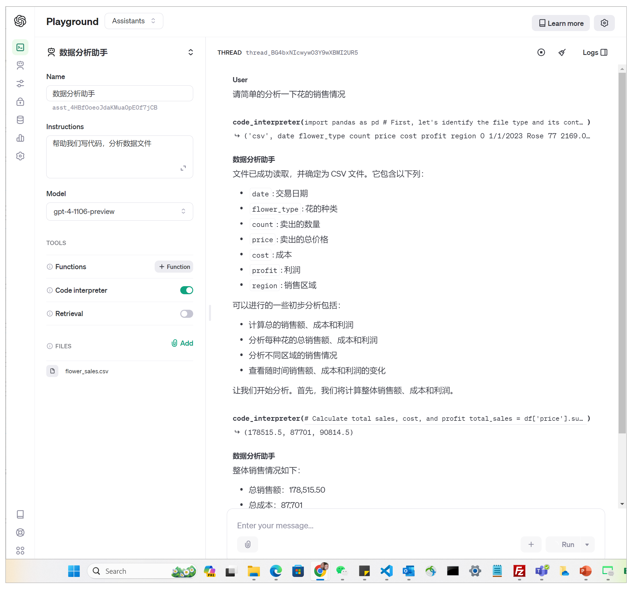 | Run的初始信息: queued Run的轮询信息: Run(id='run_202iwnMlW8nJVbEKOMPWJqVT', assistant_id='asst_ZzFnvavBoYZ59NDLnLinNC99', cancelled_at=None, completed_at=None, created_at=1713842398, expires_at=1713842998, failed_at=None, incomplete_details=None, instructions='\n Please use the flower_sales.csv data to complete the following analysis tasks:\n # 1. Group the data by region and calculate the total revenue for each region. Visualize the results using a bar chart.\n # 2. Group the data by date and calculate the daily total revenue. Create a line chart to show the revenue trend over time.\n 3. Calculate the sales proportion of each flower type and display the results in a pie chart.\n 4. Find the top 5 most profitable flowers based on the total profit.\n # 5. Using the historical sales data, forecast the total revenue for the next 7 days using a Random Forest Regressor model.\n ', last_error=None, max_completion_tokens=None, max_prompt_tokens=None, metadata={}, model='gpt-4-turbo', object='thread.run', required_action=None, response_format='auto', started_at=1713842398, status='in_progress', thread_id='thread_D3JUkq05bfvtmBw7QoNSuTy7', tool_choice='auto', tools=[CodeInterpreterTool(type='code_interpreter')], truncation_strategy=TruncationStrategy(type='auto', last_messages=None), usage=None, temperature=1.0, top_p=1.0, tool_resources={})