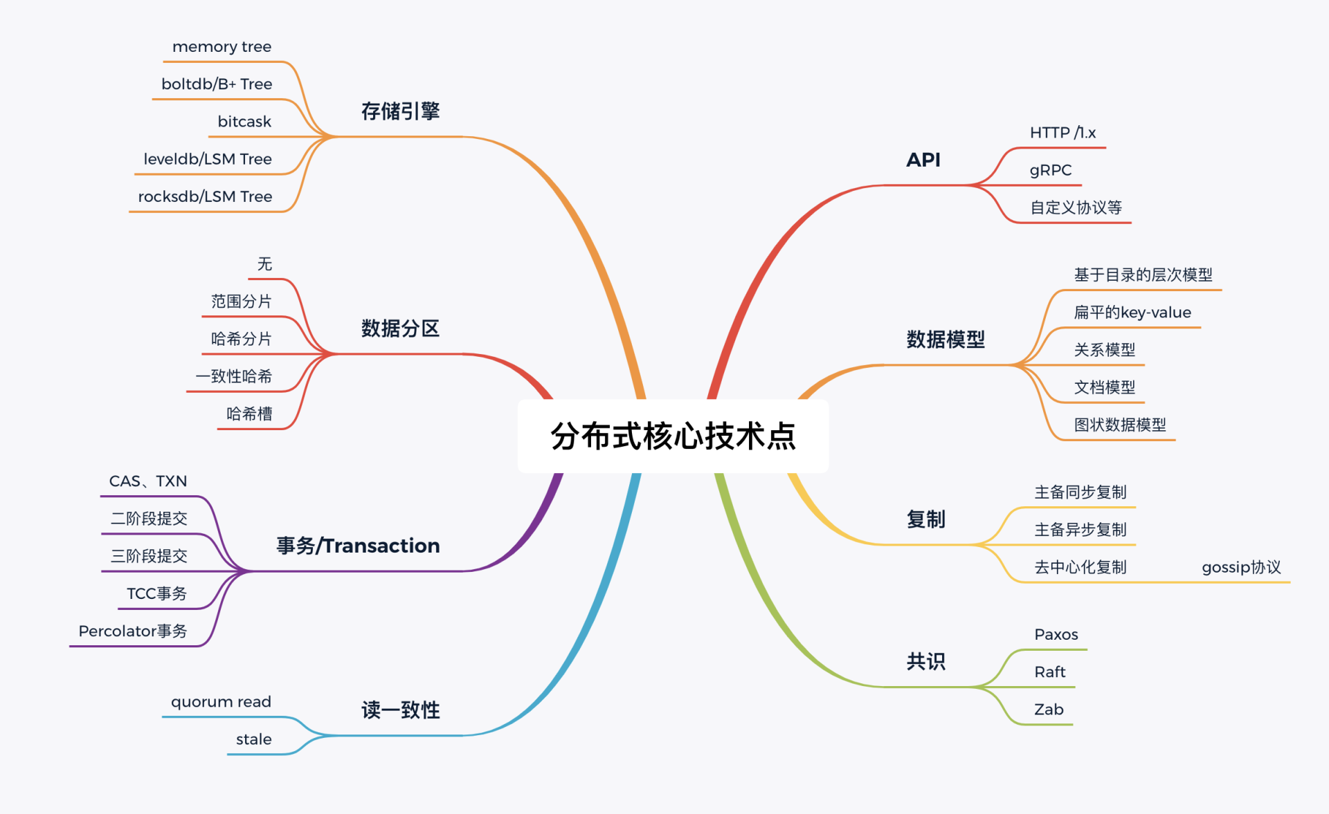 然后是数据如何存取的问题。分布式存储系统的解决方案是存储引擎。除了etcd使用的boltdb,常见的存储引擎还有我们实践篇[18]中所介绍bitcask、leveldb、rocksdb(leveldb优化版)等。不同的分布式存储系统在面对不同业务痛点时(读写频率、是否支持事务等),所选择的解决方案不一样。etcd v2使用的是内存tree,etcd v3则使用的是boltdb,而Redis Cluster则使用的是基于内存实现的各类数据结构。