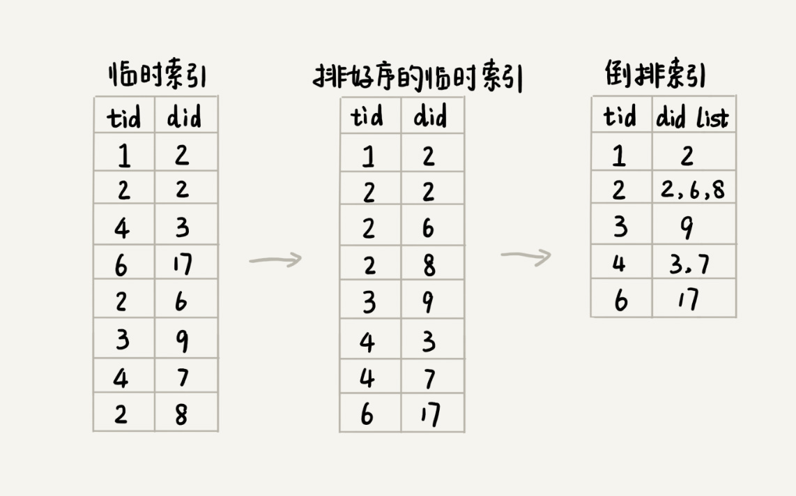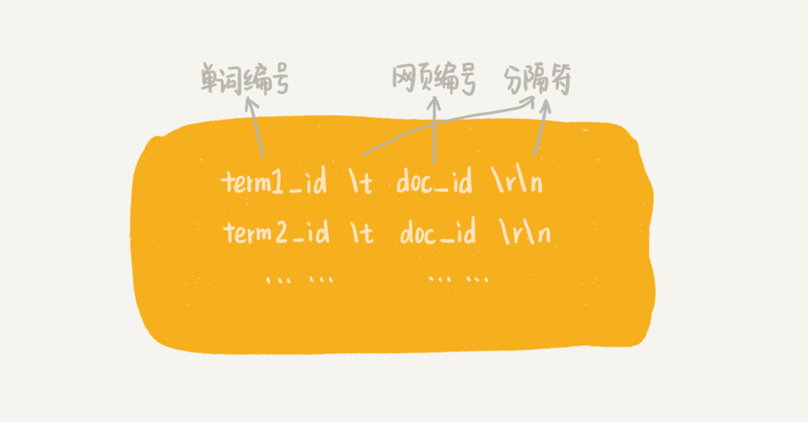 我们刚刚讲到,在临时索引文件中,记录的是单词跟每个包含它的文档之间的对应关系。那如何通过临时索引文件,构建出倒排索引文件呢?这是一个非常典型的算法问题,你可以先自己思考一下,再看我下面的讲解。