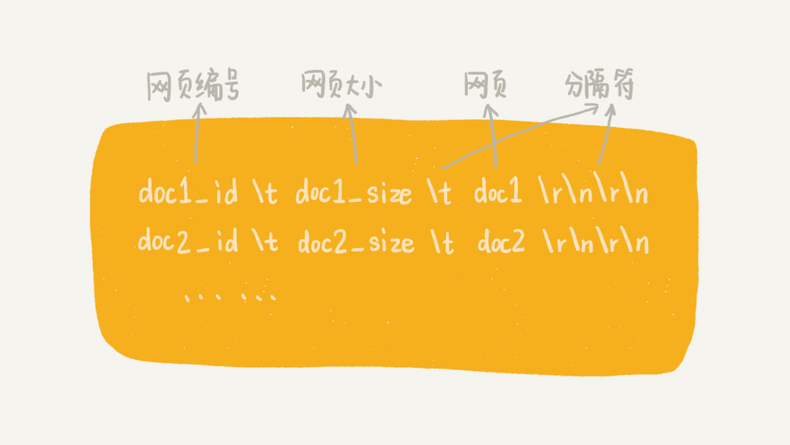 如果我们把每个网页都存储为一个独立的文件,那磁盘中的文件就会非常多,数量可能会有几千万,甚至上亿。常用的文件系统显然不适合存储如此多的文件。所以,我们可以把多个网页存储在一个文件中。每个网页之间,通过一定的标识进行分隔,方便后续读取。具体的存储格式,如下图所示。其中,doc_id这个字段是网页的编号,我们待会儿再解释。