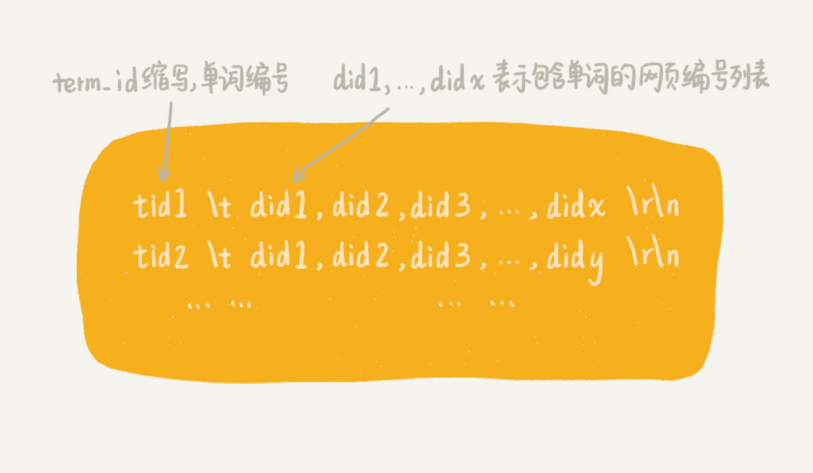索引阶段主要负责将分析阶段产生的临时索引,构建成倒排索引。倒排索引( Inverted index)中记录了每个单词以及包含它的网页列表。文字描述比较难理解,我画了一张倒排索引的结构图,你一看就明白。