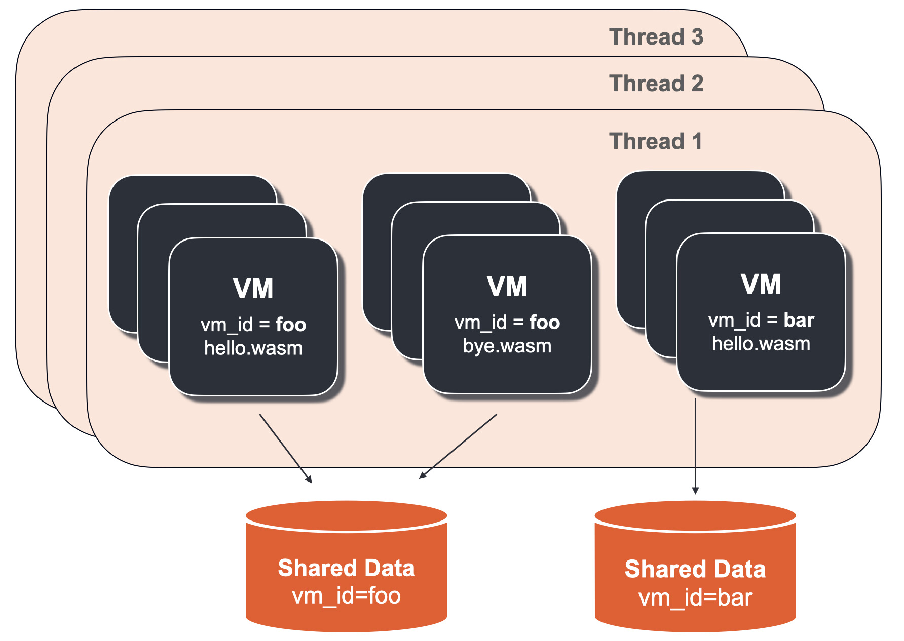 共享数据 KVS 是根据 vm_config 中指定的创建的。可以在所有 Wasm VMs 之间共享一个键值存储,而它们不必具有相同的二进制文件 vm_config.code,唯一的要求是具有相同的 vm_id。