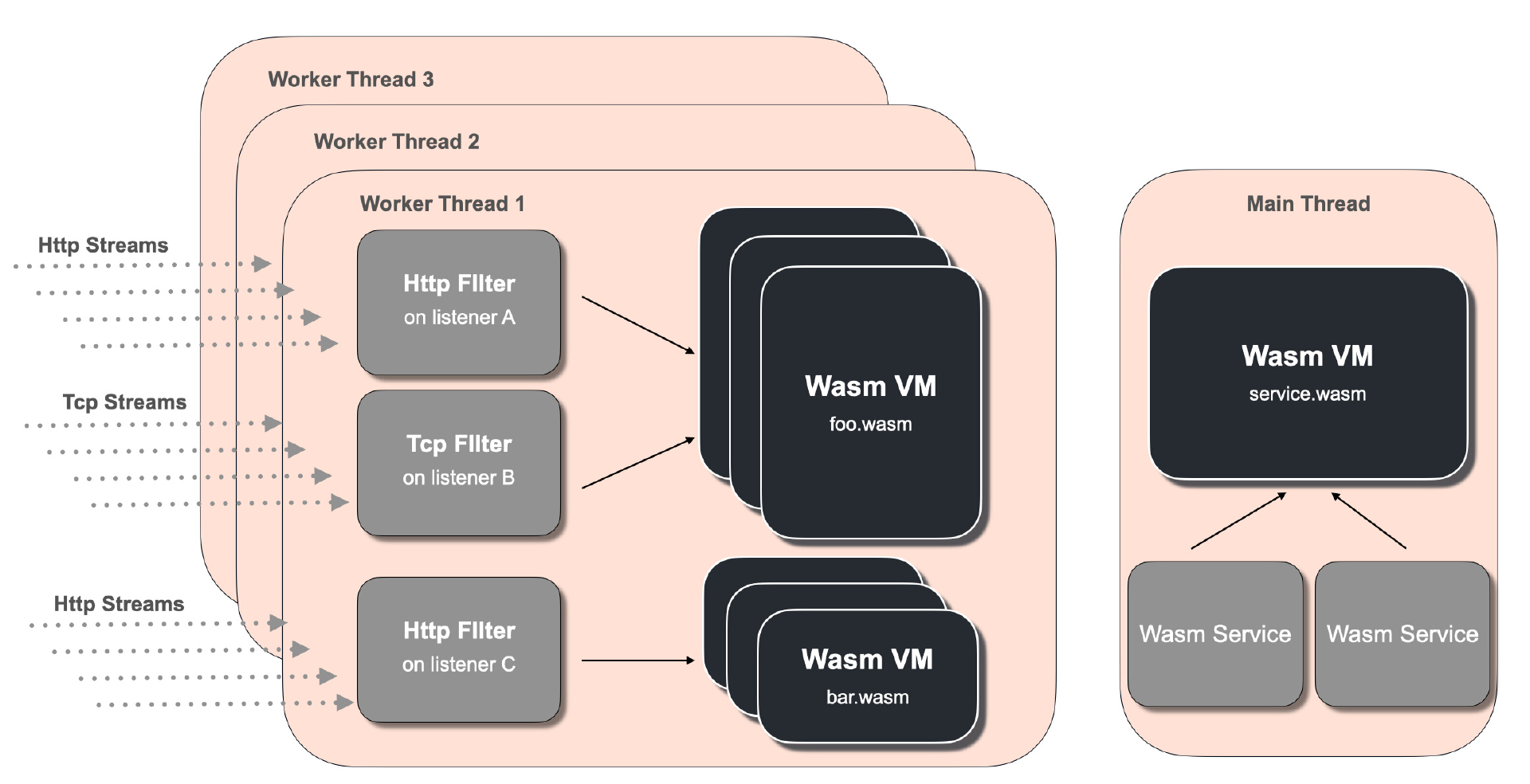 - Wasm Service 是在单例 VM 中运行的插件类型(即在 Envoy 主线程中只有一个实例)。它主要用于执行与 Network Filter 或 Http Filter 并行的一些额外工作,如聚合指标、日志等。这样的单例 VM 本身也被称为 Wasm Service。其架构如下: