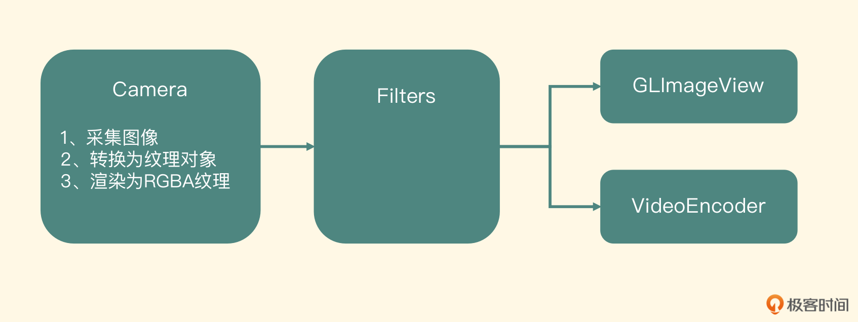 回顾第[14节课]的内容,我们已经把Camera连接到了GLImageView上面,用户也可以在屏幕上预览到摄像头采集到的图像了。在这个设计里,Camera是输入节点,它把采集到的YUV数据渲染成为纹理对象,然后传递给GLImageView,GLImageView把纹理对象渲染到UIView上。