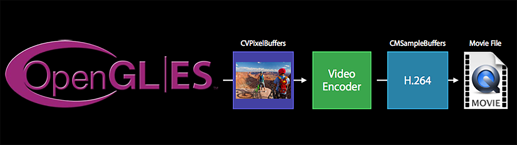 可以看到,AVAssetWriter是从OpenGL ES中拿到纹理对象,关联到CoreVideo这个framework提供的CVPixelBuffer里,然后使用VideoToolbox编码,最后把编码的H264码流写到H264文件或者封装到一个视频文件中。但如果只是封装成一个MP4文件,其实并不需要这么麻烦,我们可以利用iOS给我们封装好的API很简单地完成这种场景,如下图所示。