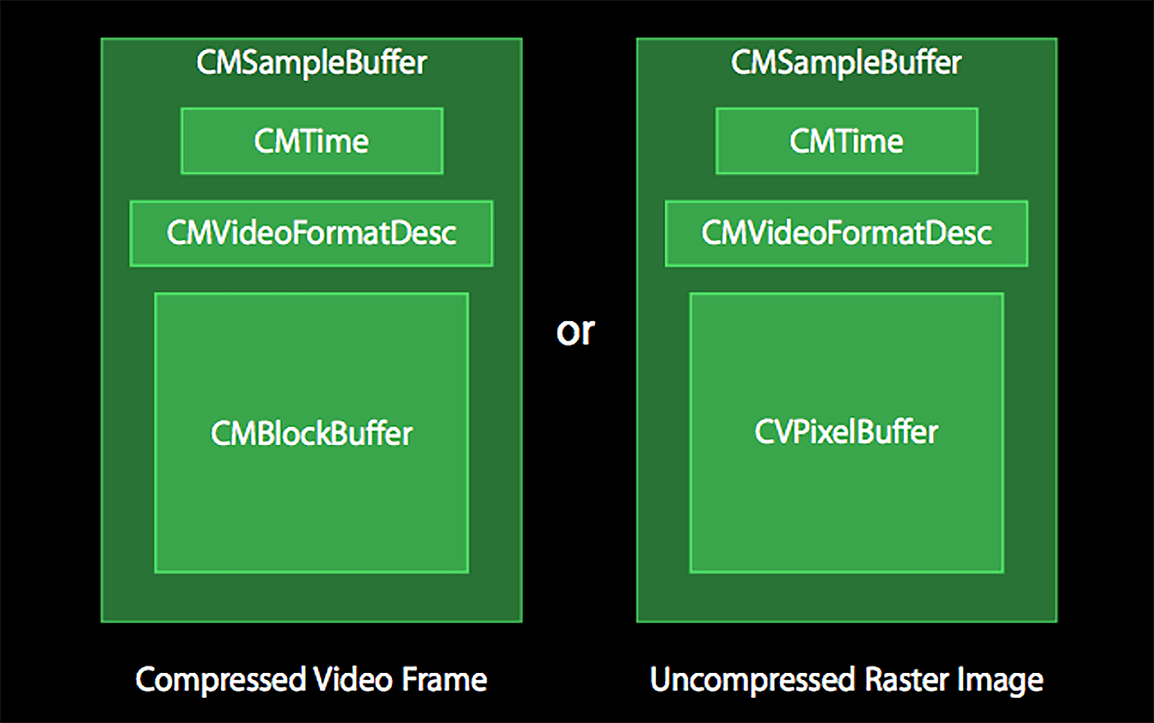 图片展示了CMSampleBuffer的构成方式,左边代表了压缩数据(编码器输出的格式)的构成,右边代表了非压缩格式(摄像头采集到的数据或者解码器解码出来的数据)的构成。而CMBlockBuffer就是编码之后数据存放的对象,我们可以调用CMBlockBufferGetDataPointer方法来获取出内存中的指针,然后可以使用对应内存中的数据去写文件或者发送到网络。