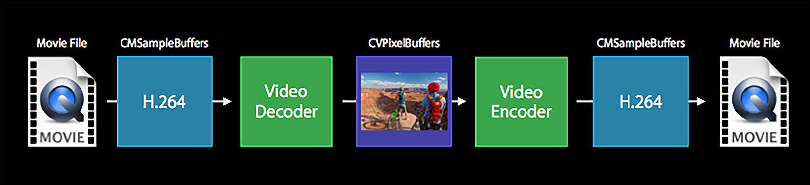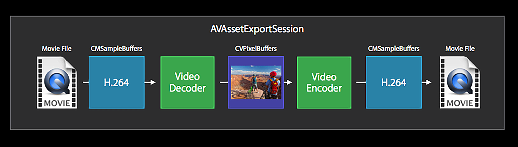 这个类可以用来拼接视频、合并音频和视频、不做任何处理的转换格式以及压缩视频等多种场景,其实它是对VideoToolbox解码、编码的一个更高层次的封装,如图所示。