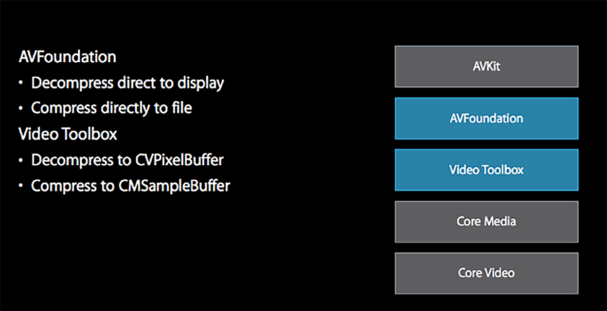 如图所示,iOS平台提供的AVFoundation底层使用了VideoToolbox,但是它们的关注点不一样。VideoToolbox更关注编码成内存中的CMSampleBuffer结构体,以及解码成主内存(或者理解为显存)里的CVPixelBuffer结构体,而AVFoundation更关注解码直接显示以及编码到文件中。