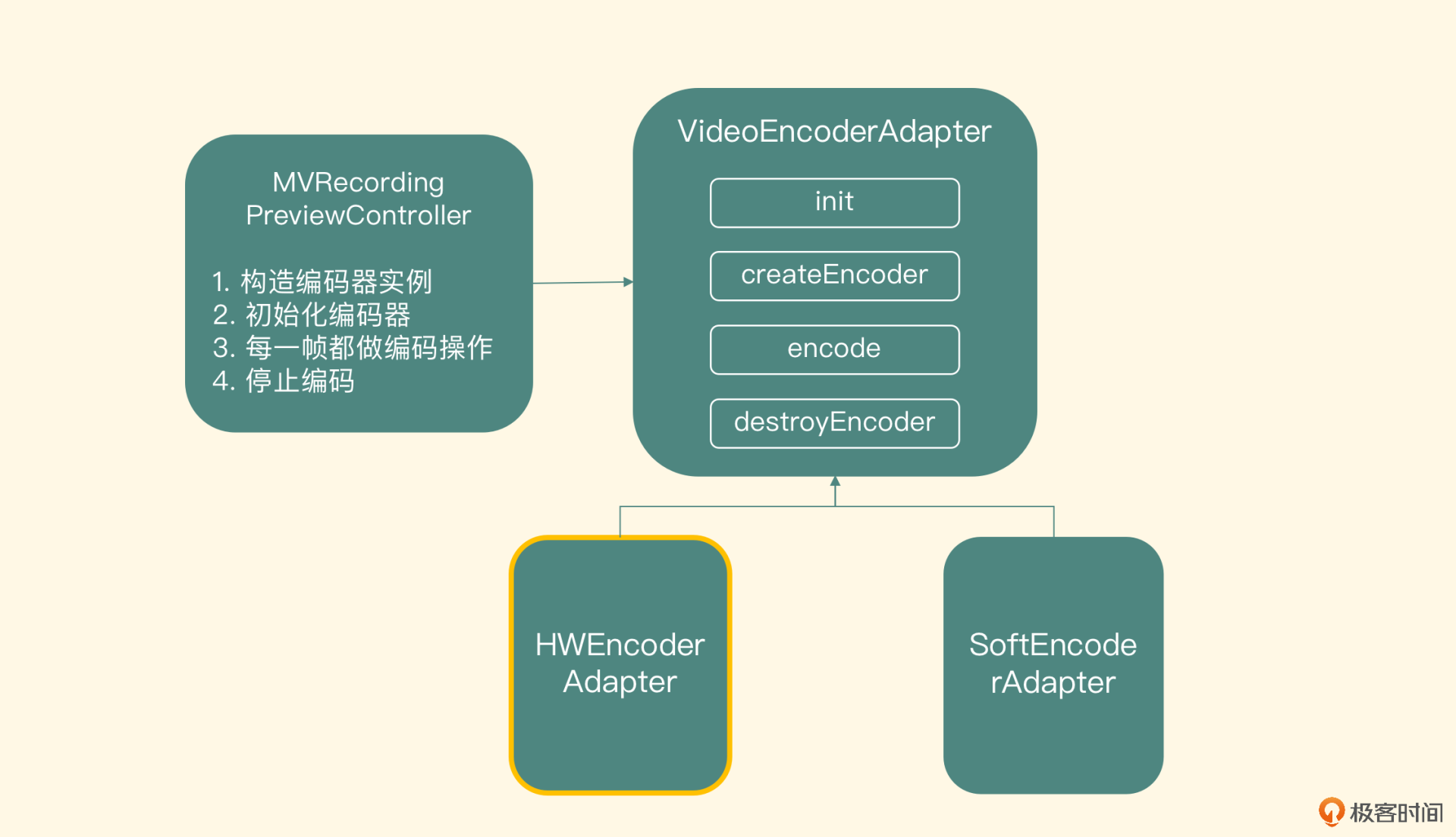 新建的hw_encoder_adapter类继承自video_encoder_adapter这个类,然后实现核心的接口,包括创建编码器的createEncoder方法、实际编码的encode方法以及销毁编码器的destroyEncoder方法。