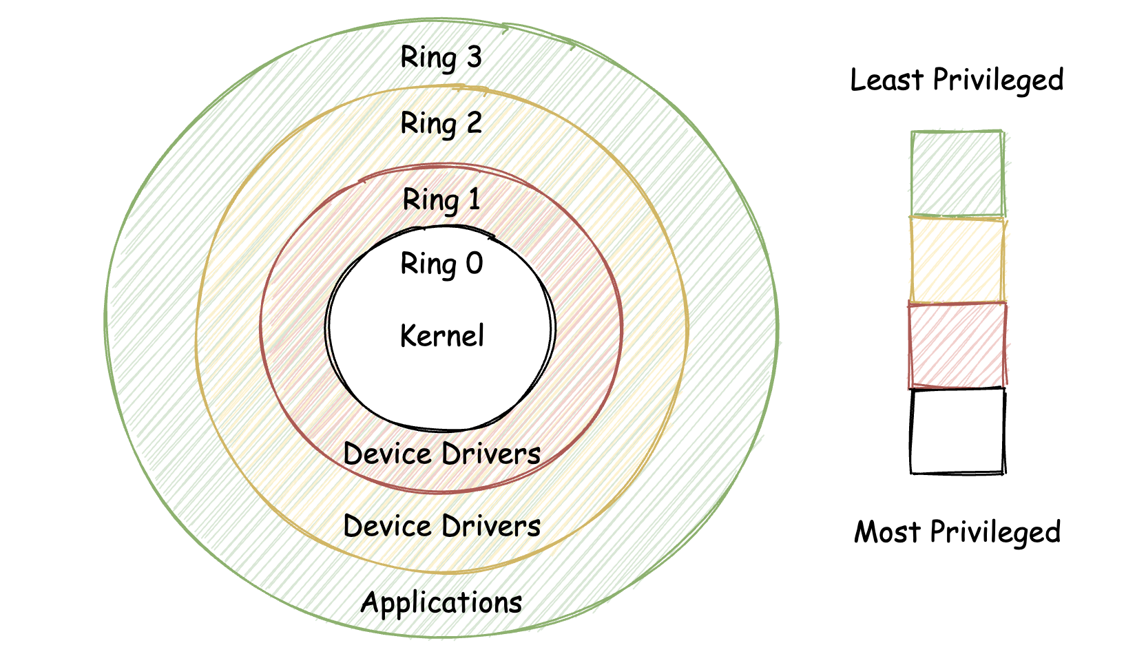 基于“分级保护域”实现的安全模型,被广泛应用于类 Unix 的各类操作系统中,比如下图所示的操作系统 Ring0 层和 Ring3 层(Ring1 / Ring2 一般不会被使用)便是“分级保护域”的一种具体实现形式。