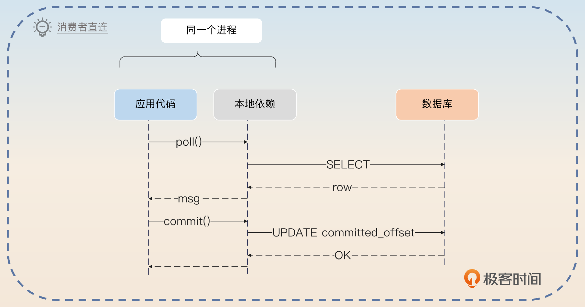 还有一个优化消费者性能的地方,就是提供一个本地依赖,让消费者通过这个本地依赖直连数据库,直接从数据库中读取消息。同样地,消费者也通过这个本地依赖来提交消息。